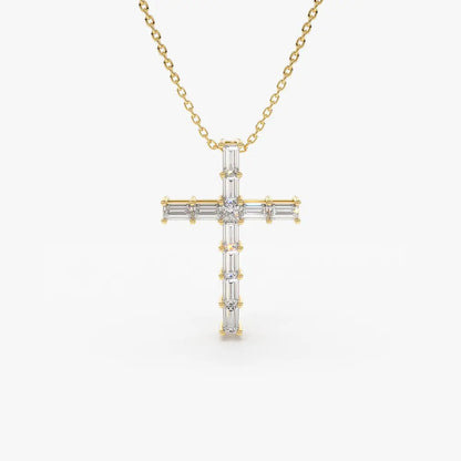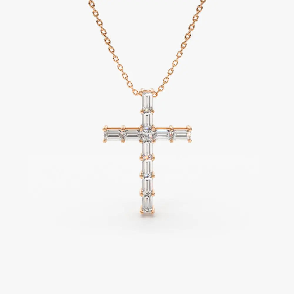 • Cross Pendant Design: Classic cross shape enhanced with baguette diamonds for modern sophistication