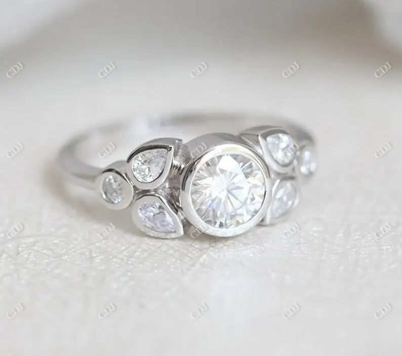 The round and pear-shaped moissanites are carefully set to maximize sparkle, giving this ring an artistic, asymmetrical charm that stands out from traditional designs