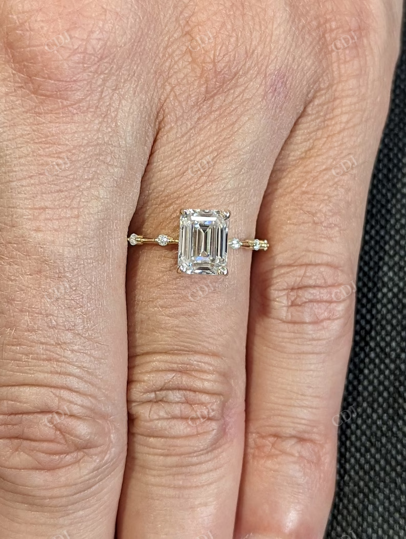 • Stunning 1.5 Carat Emerald-Cut Moissanite: This ring features a striking 1.5 CT emerald-cut moissanite stone, known for its exceptional fire and brilliance. The elongated shape enhances finger length and adds a vintage-inspired elegance.