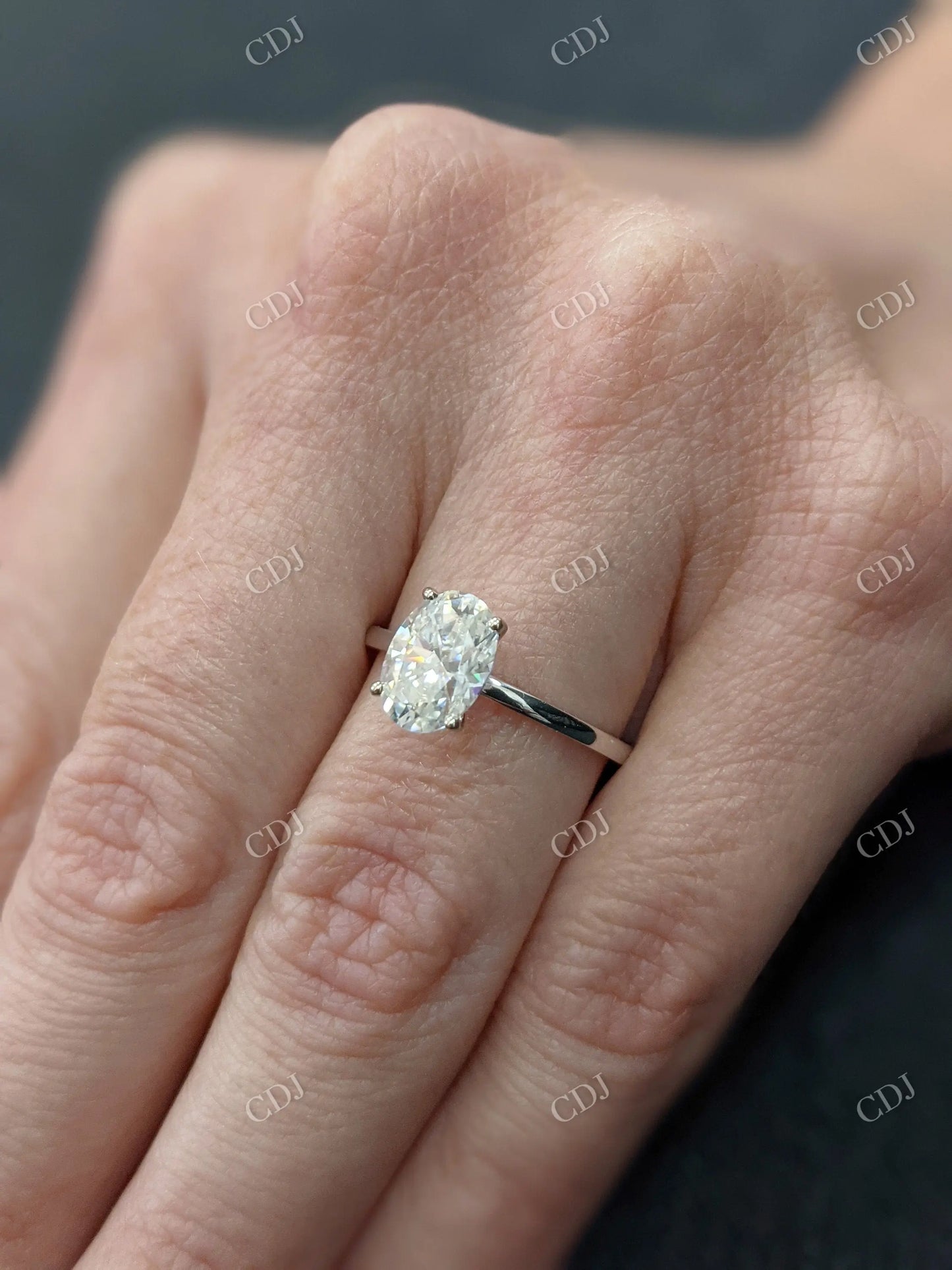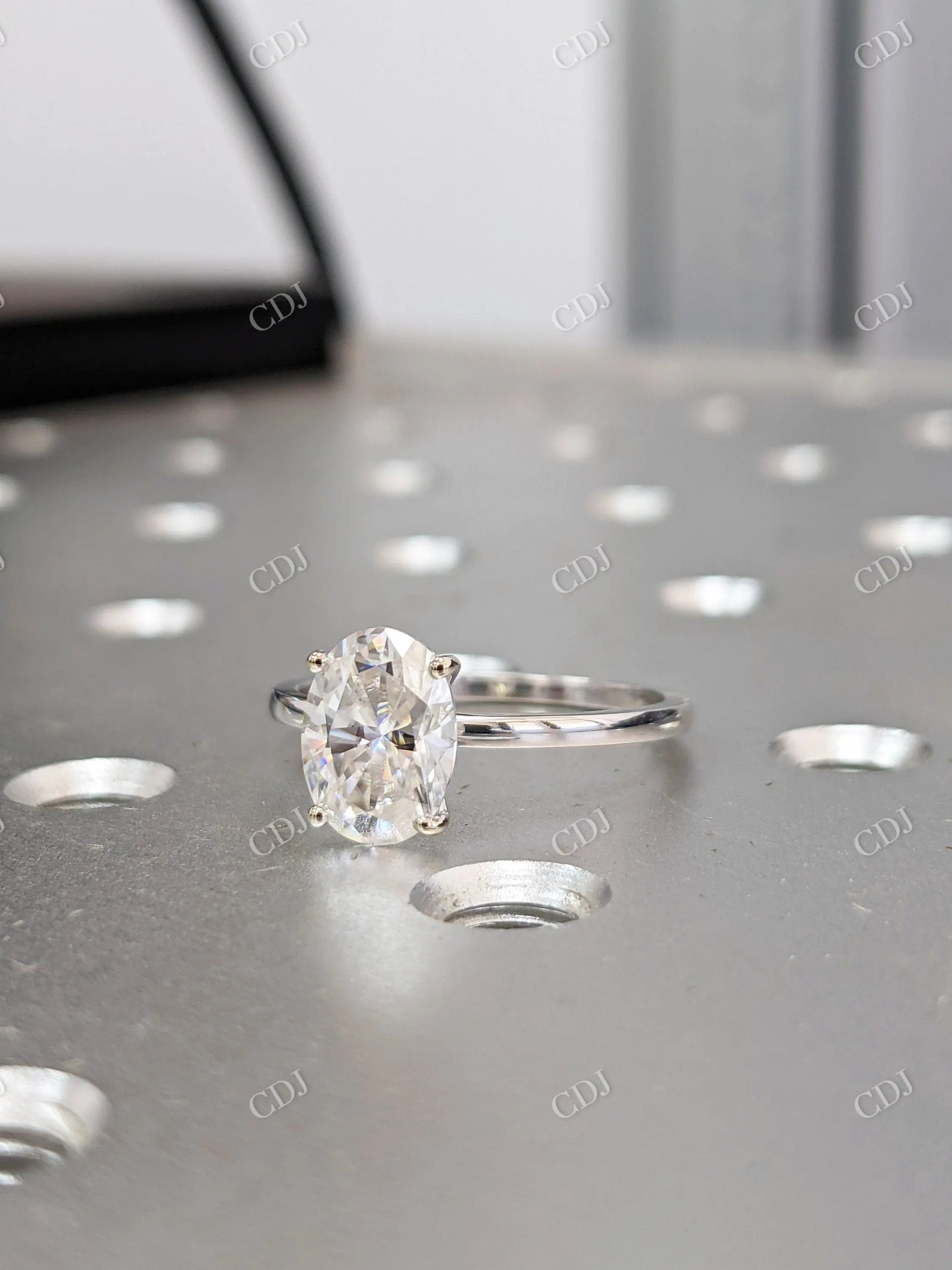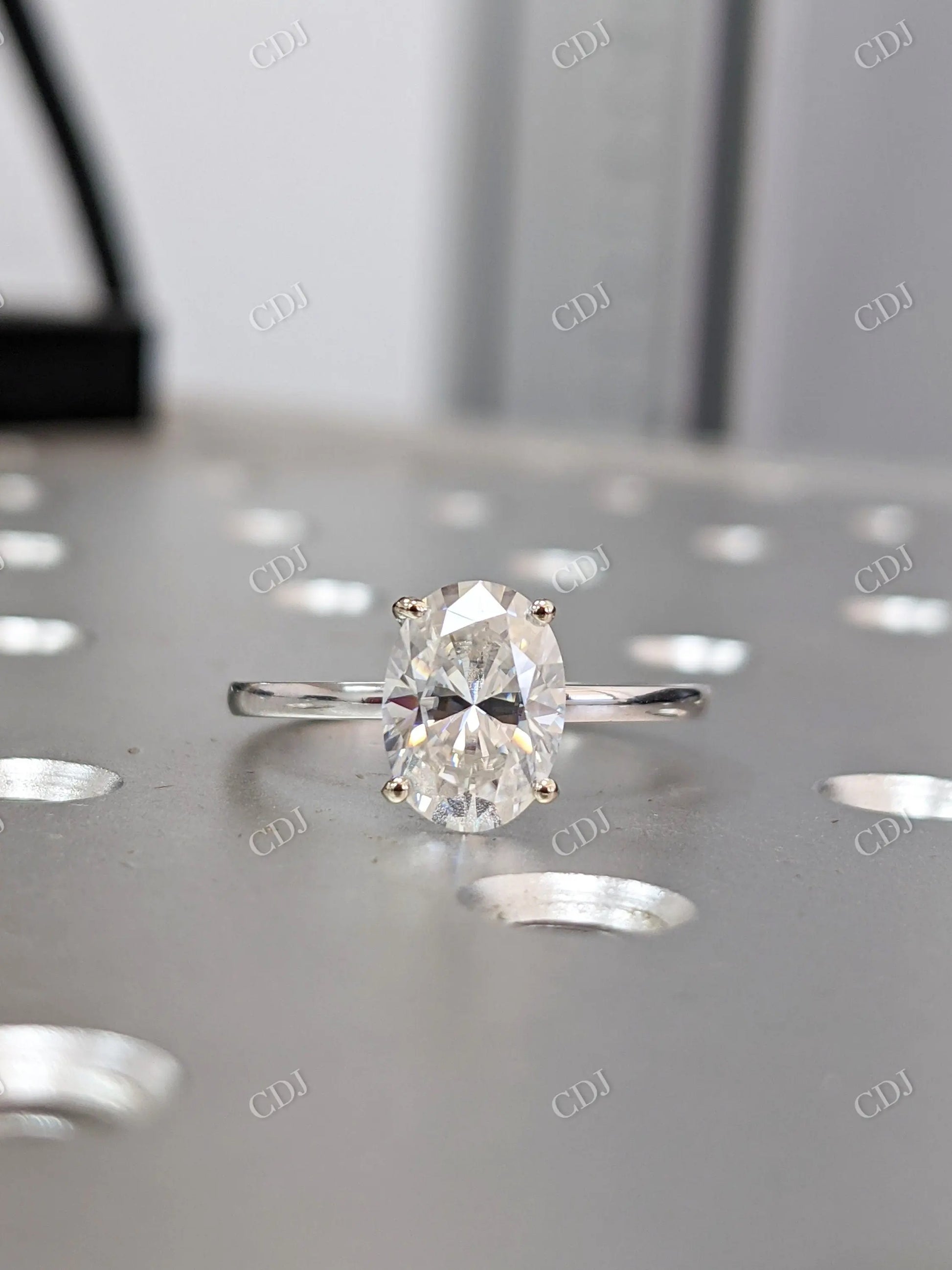 • Stone: Oval brilliant-cut moissanite (DEF color, VVS clarity)