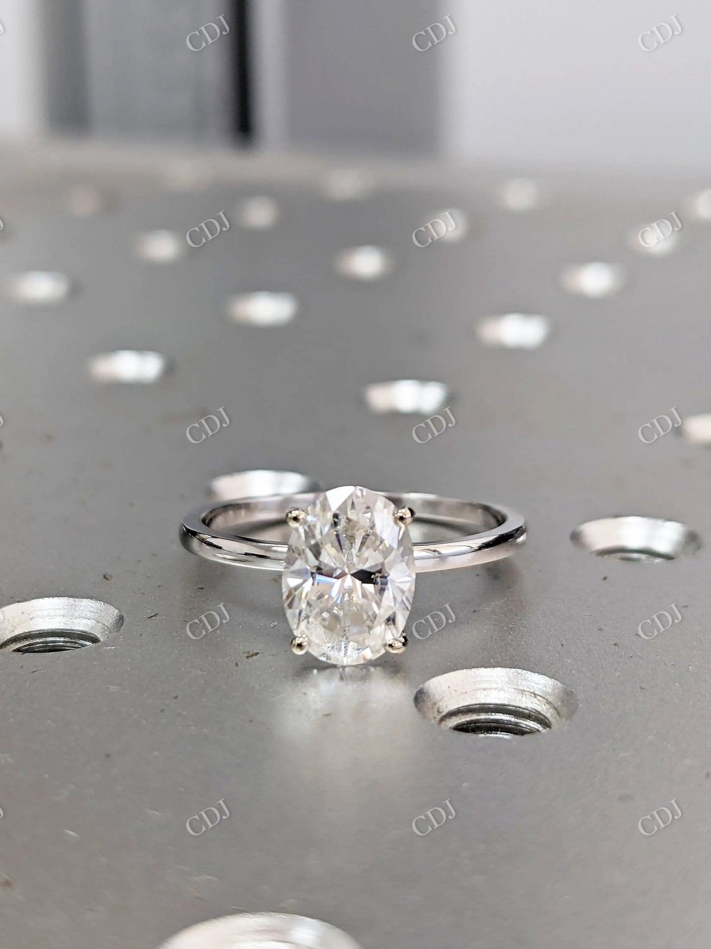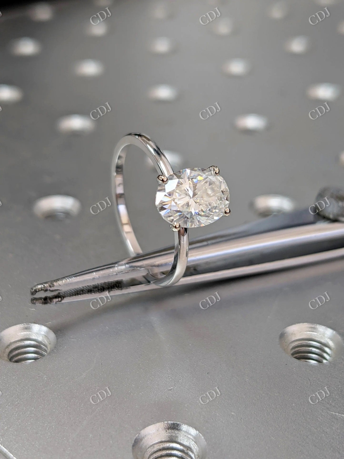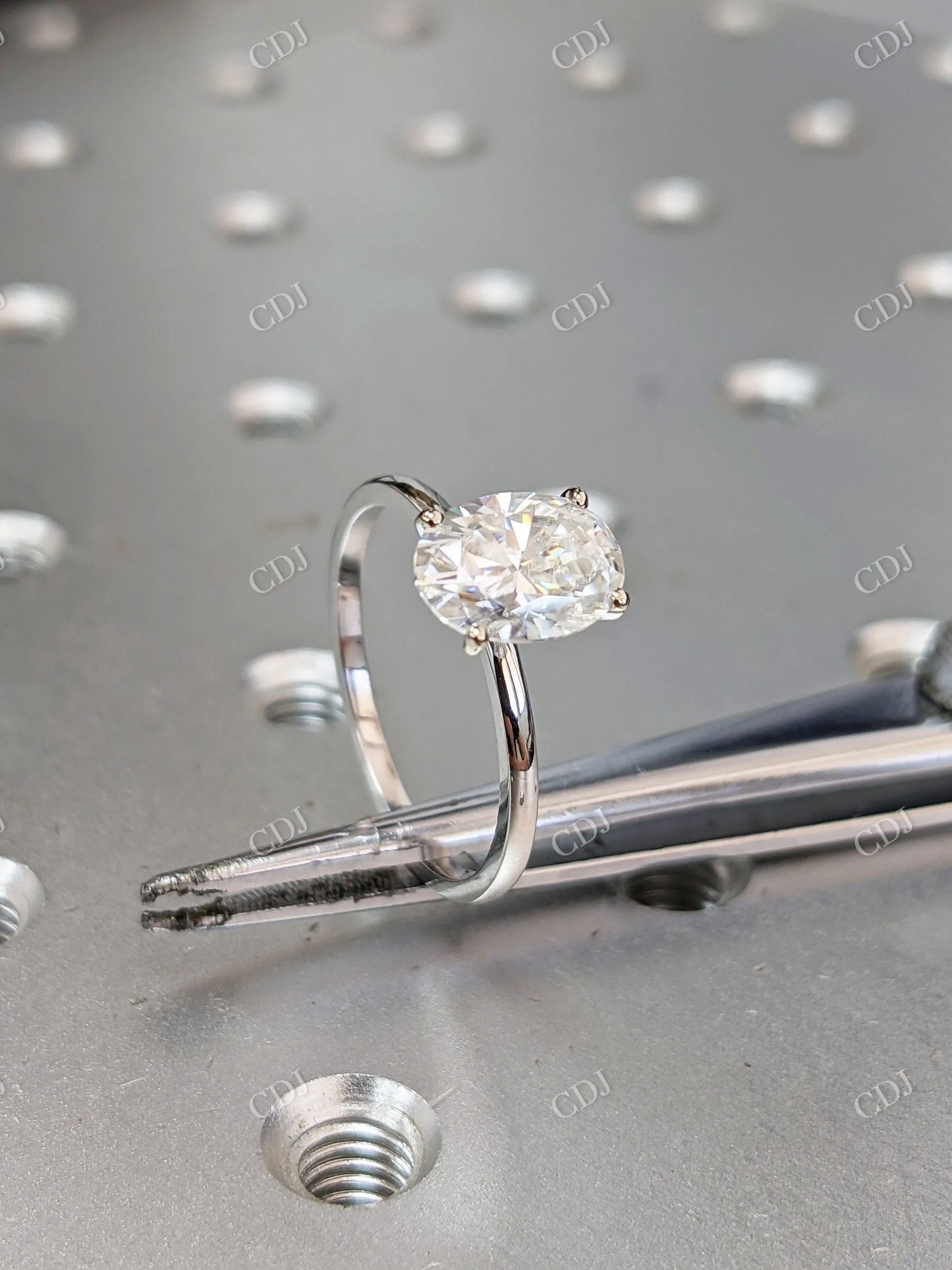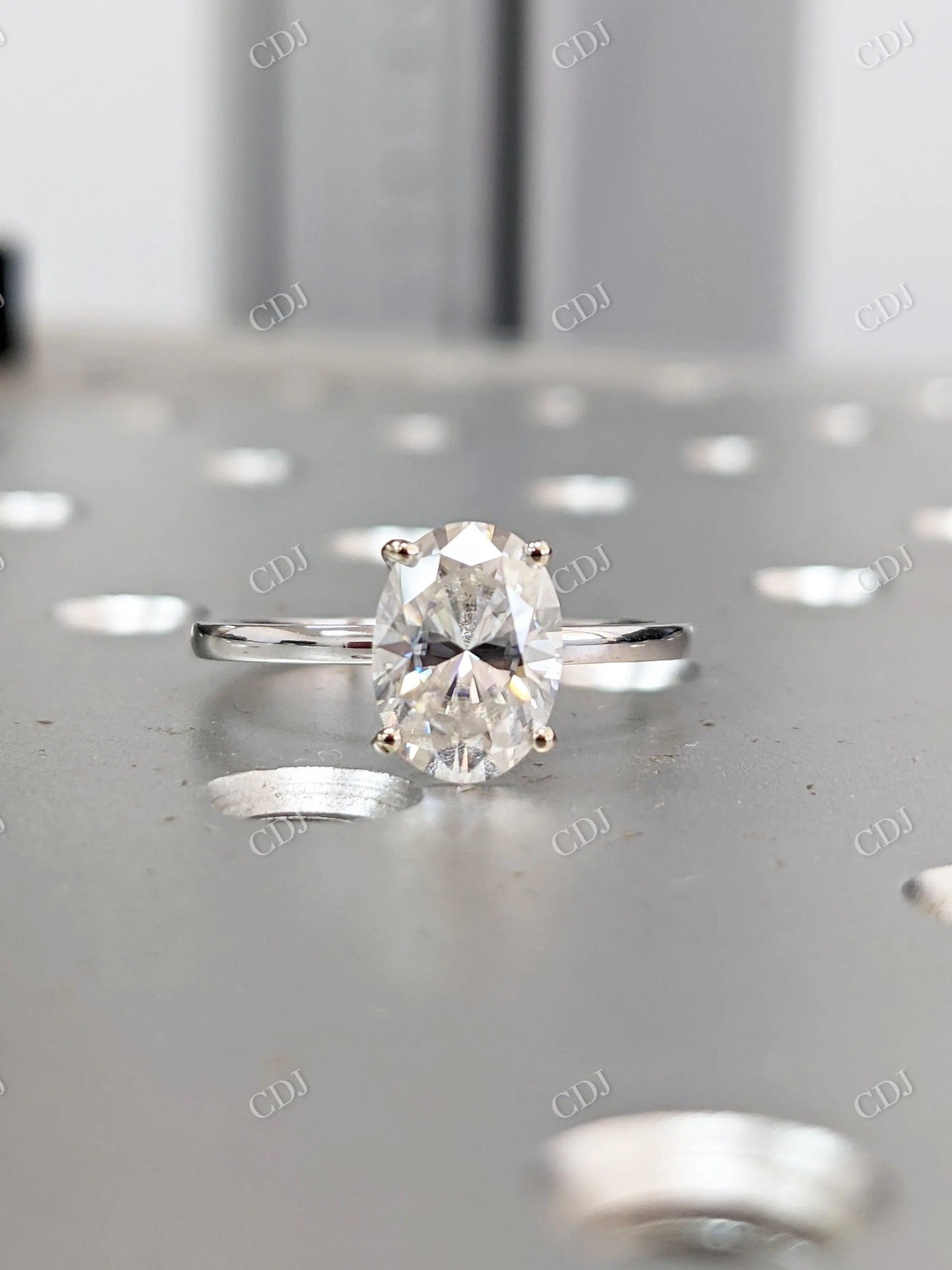 • Stone: Oval brilliant-cut moissanite (DEF color, VVS clarity)