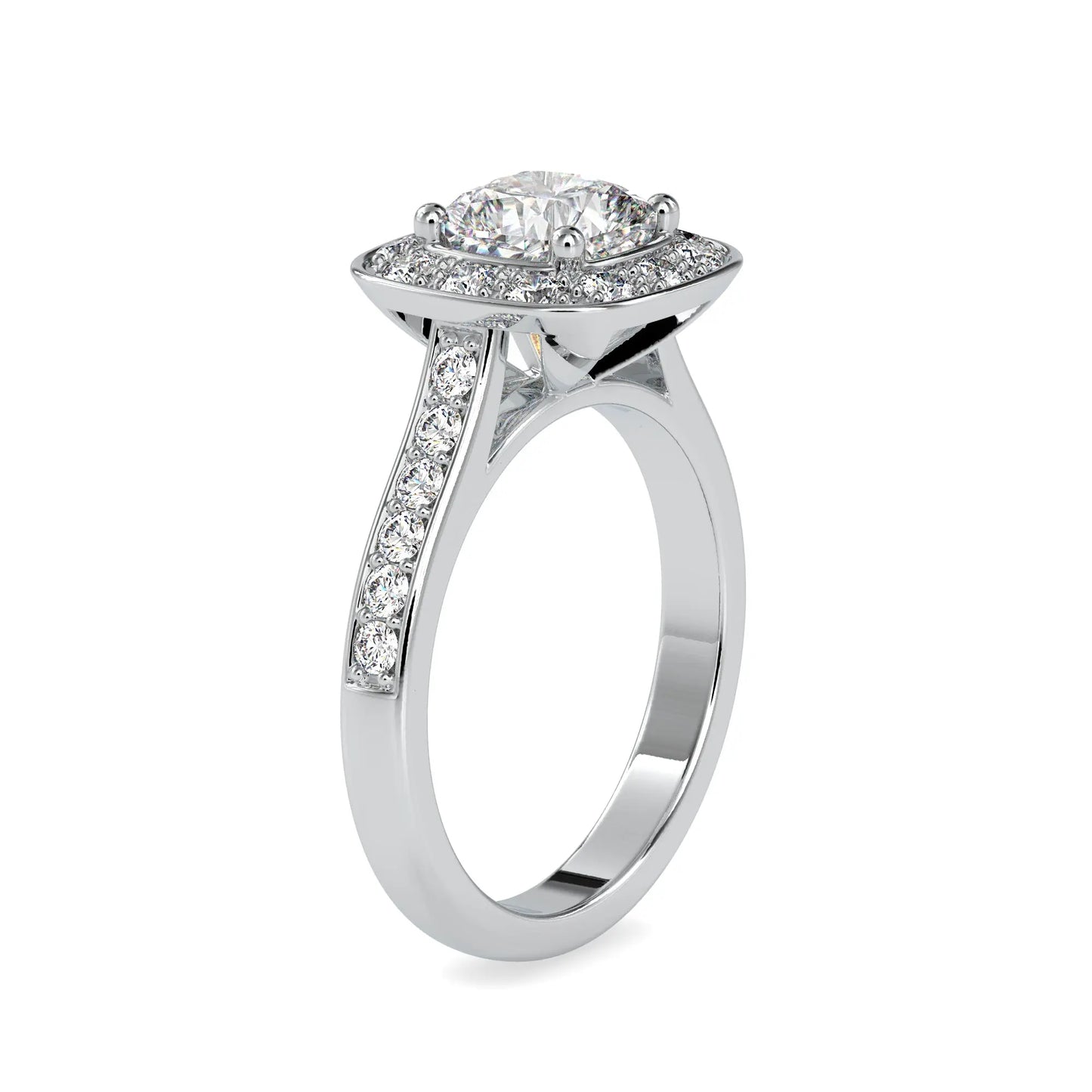 Cushion-cut center stone framed by a halo of brilliant smaller diamonds