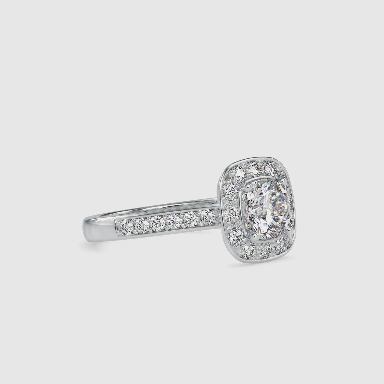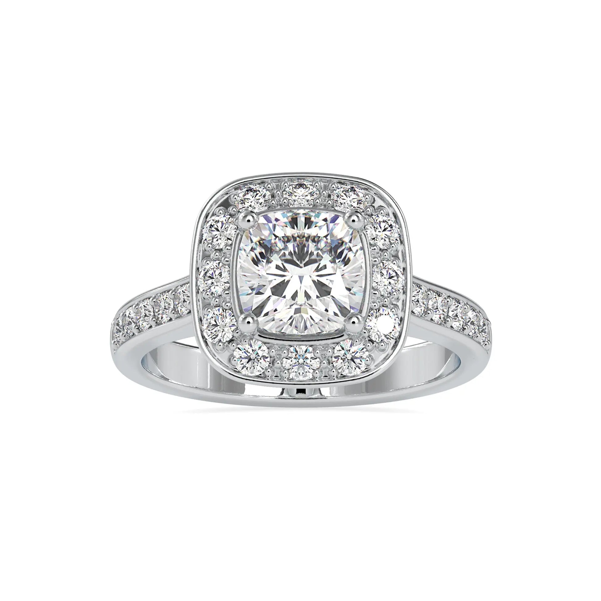Perfect for engagements, anniversaries, or special celebrations, the cushion halo setting enhances the size and fire of the center stone, creating a captivating sparkle that shines from every angle.