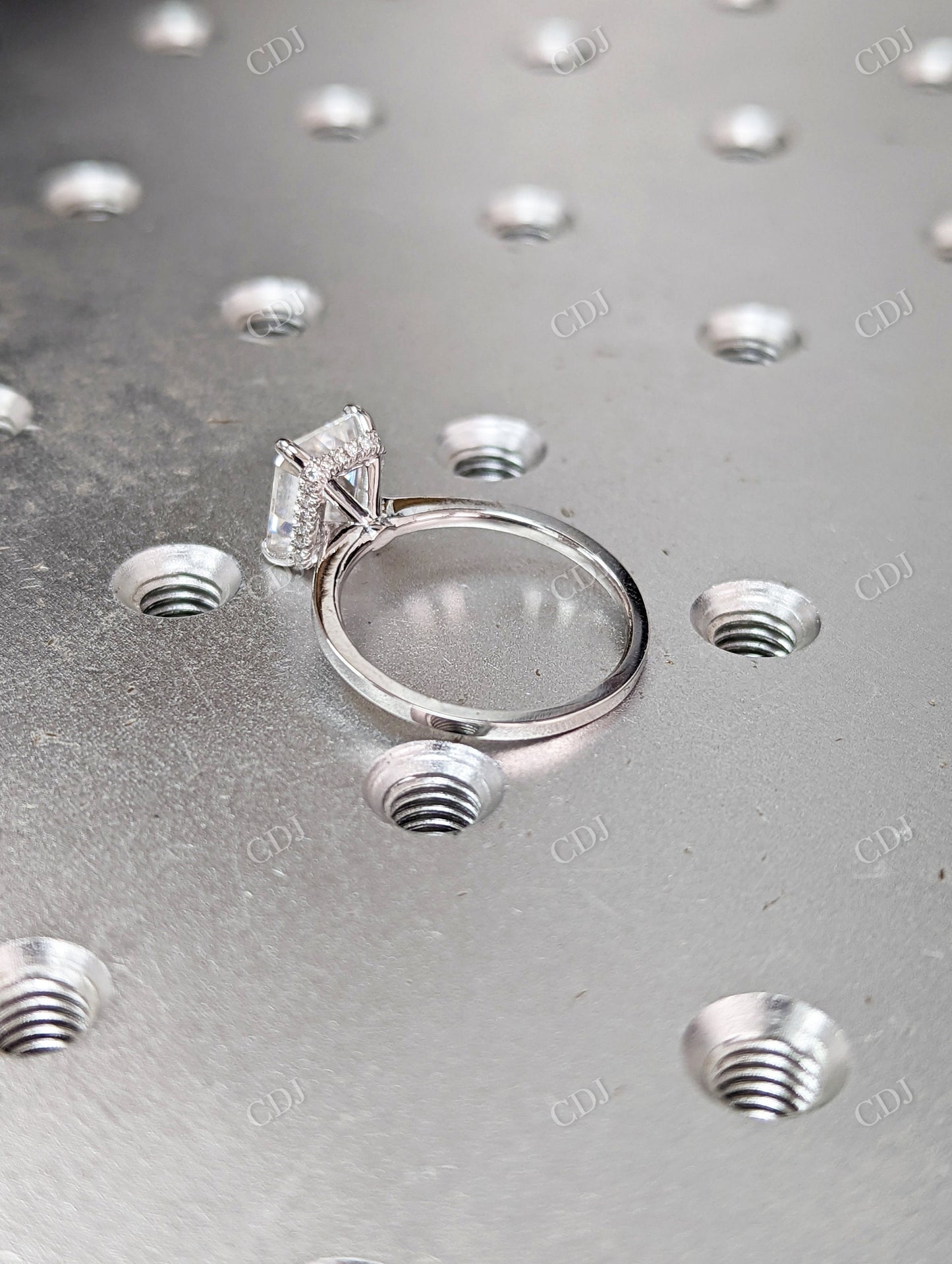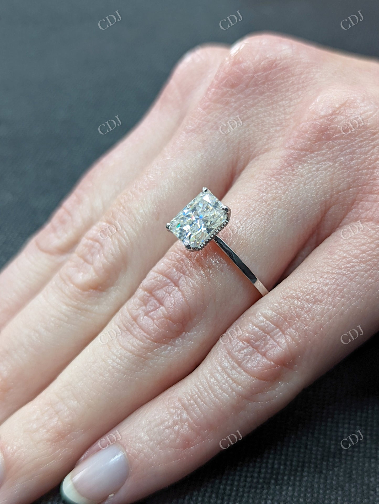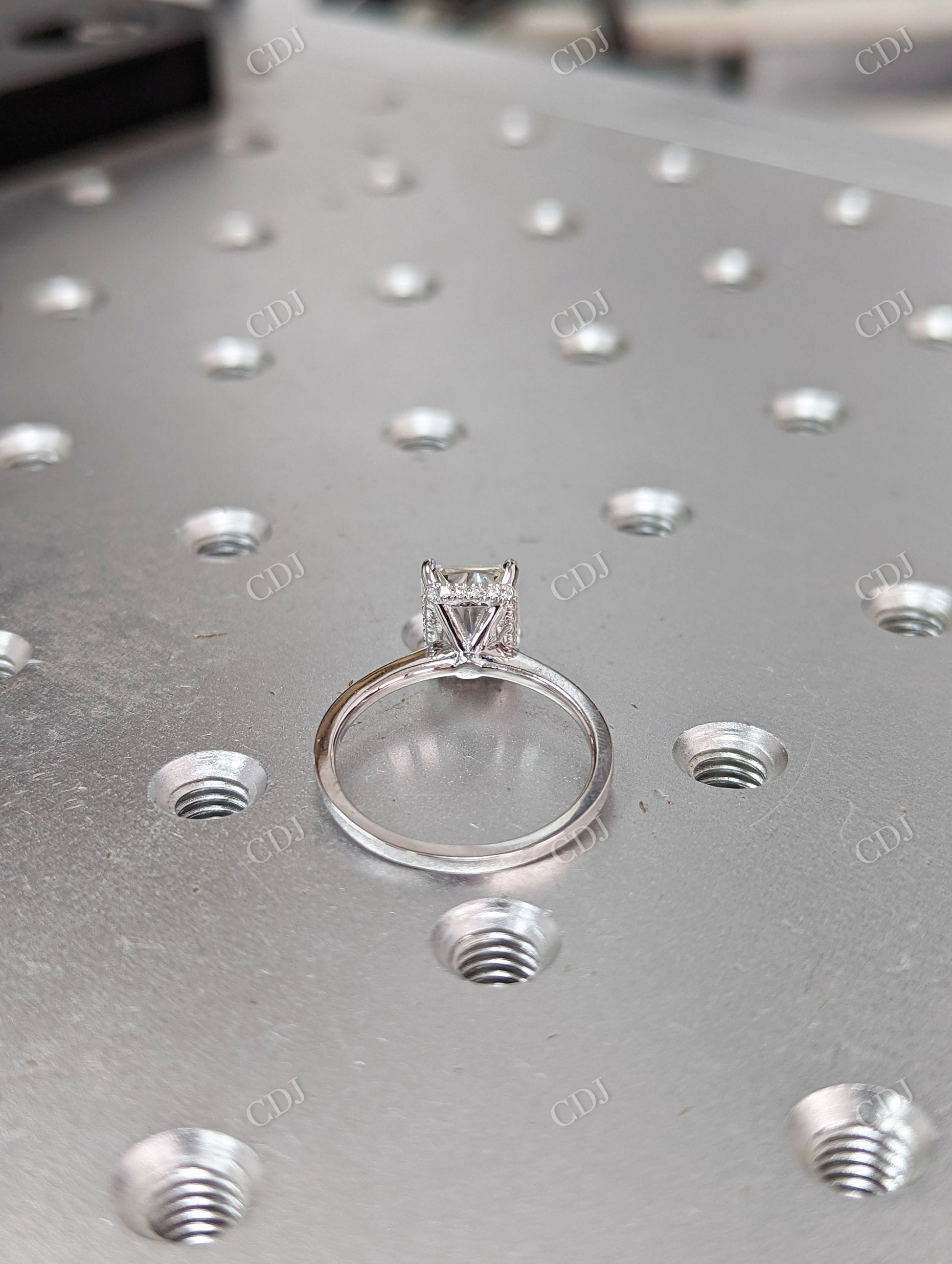 Each ring is carefully made to highlight the brilliance of the radiant cut. The hidden halo is discreetly nestled beneath the crown, catching the light with every movement. From proposal to anniversary and beyond, it’s a ring that speaks of love, intention, and exquisite taste.