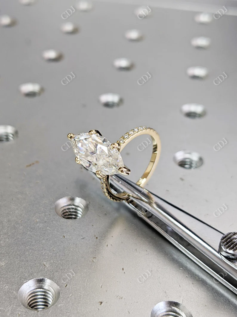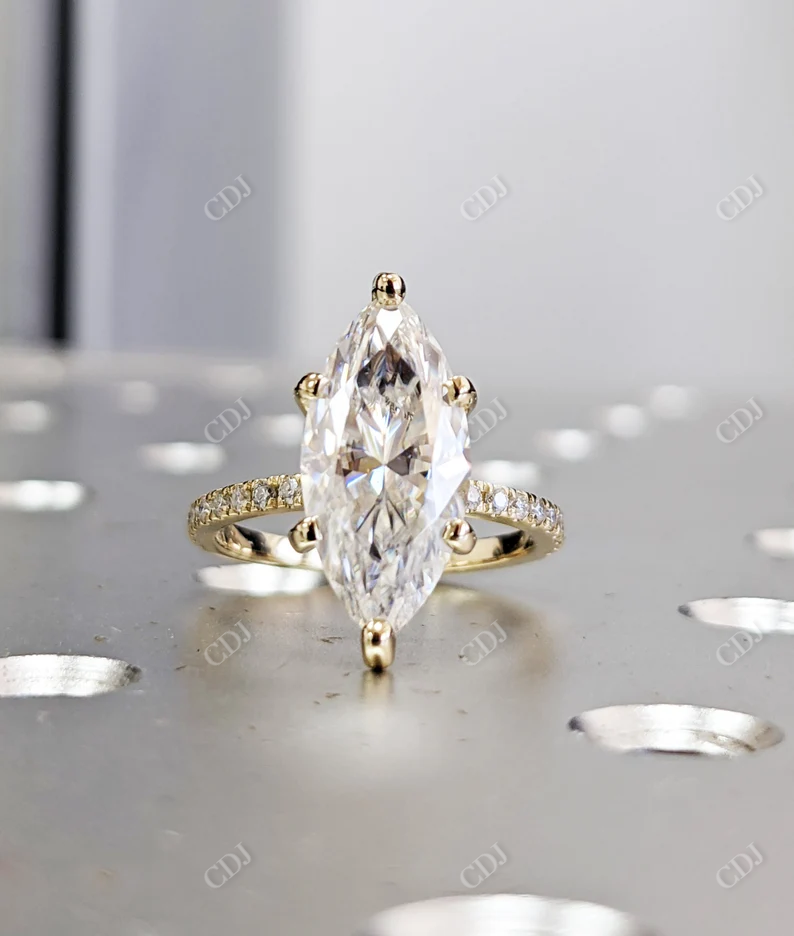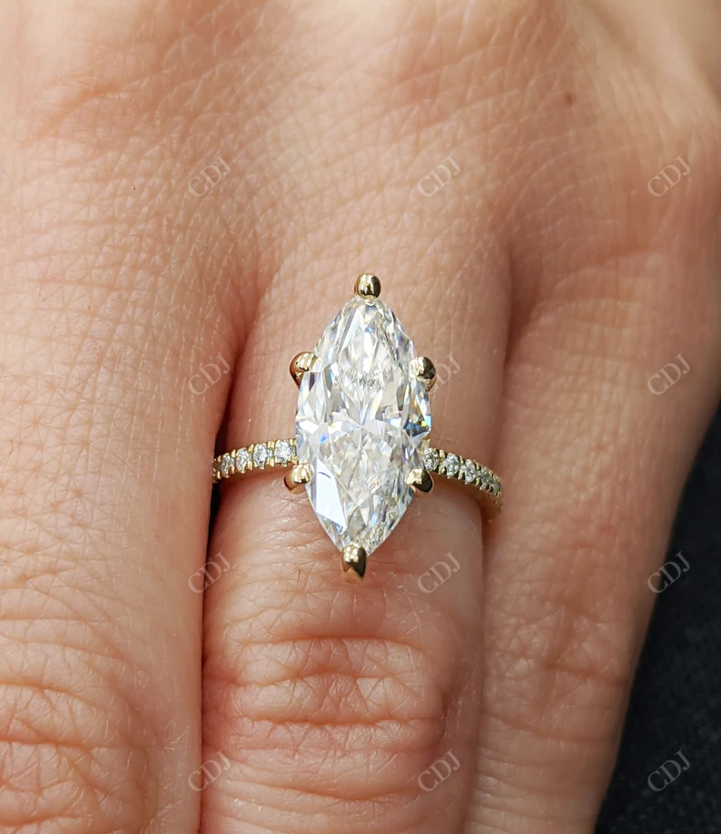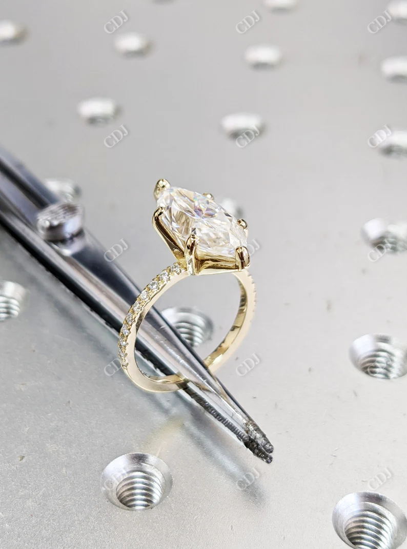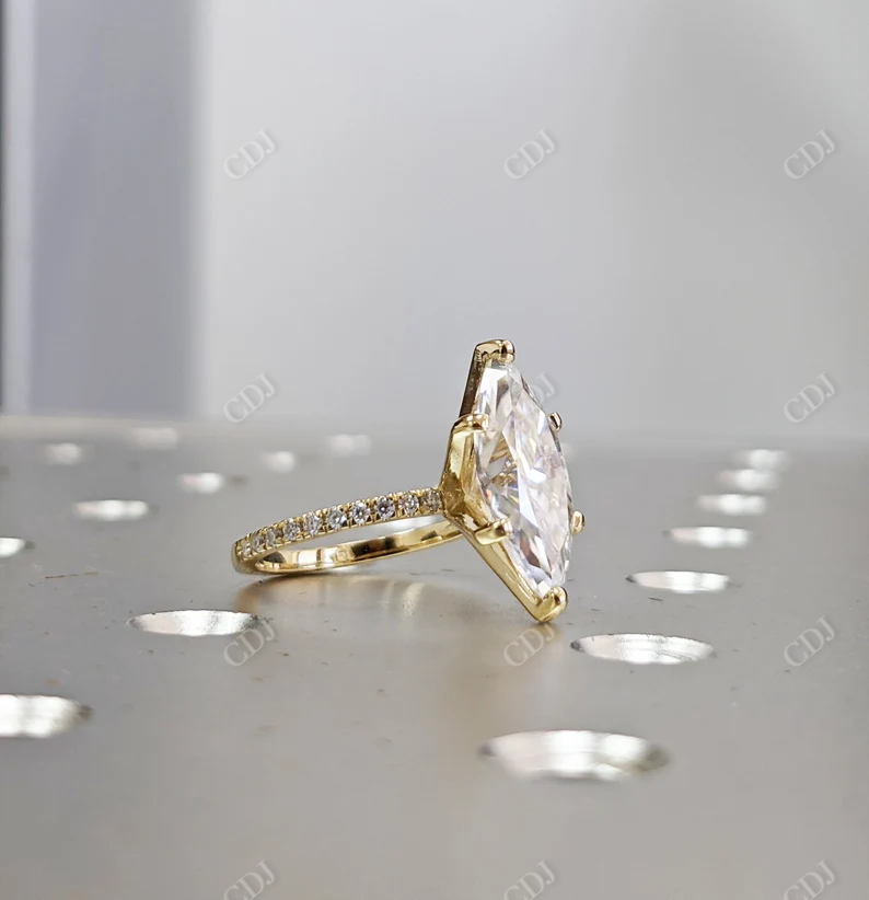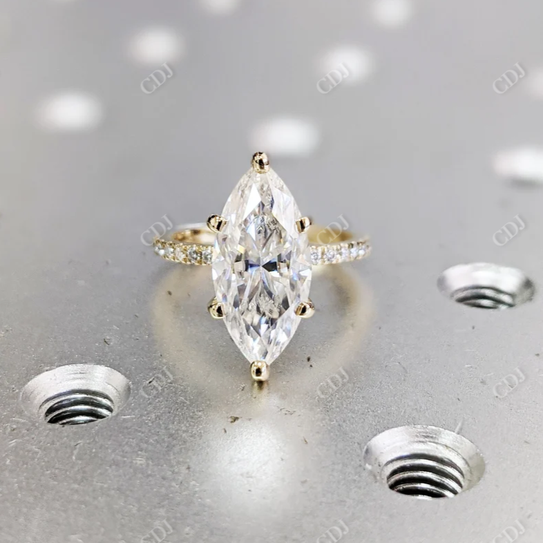 • Center Stone: 3.0 carat marquise cut moissaniteknown for its elongated shape and dramatic sparkle