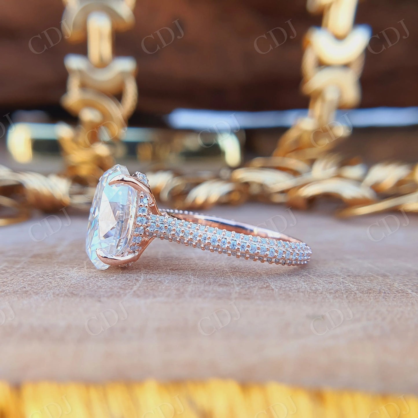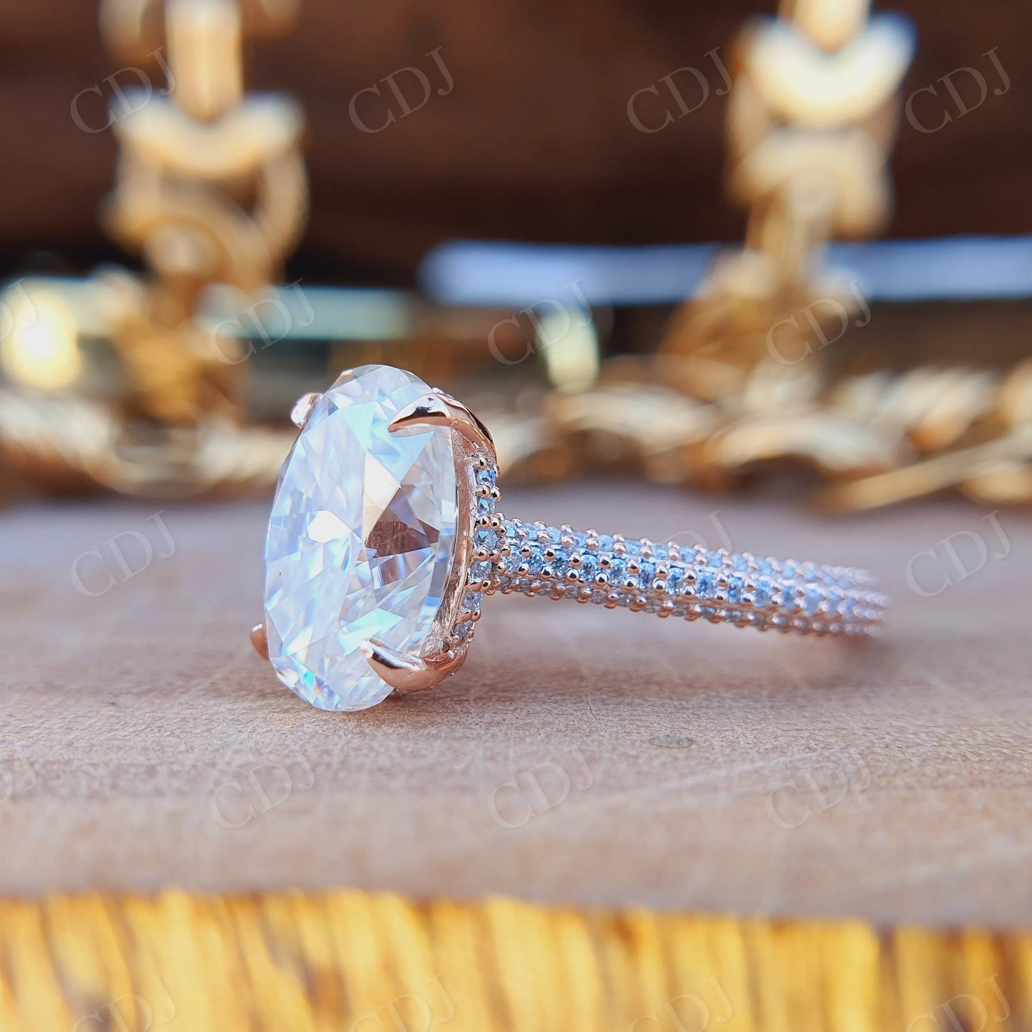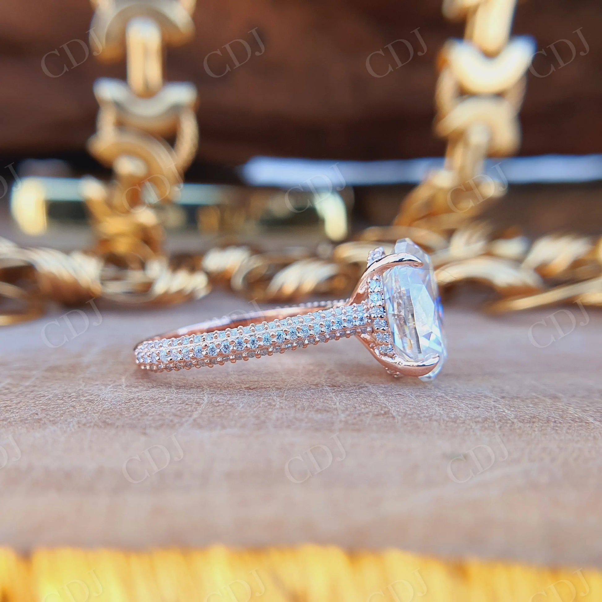 • Halo Setting: Circle of brilliantly cut moissanite stones amplifies light return and adds luxurious depth