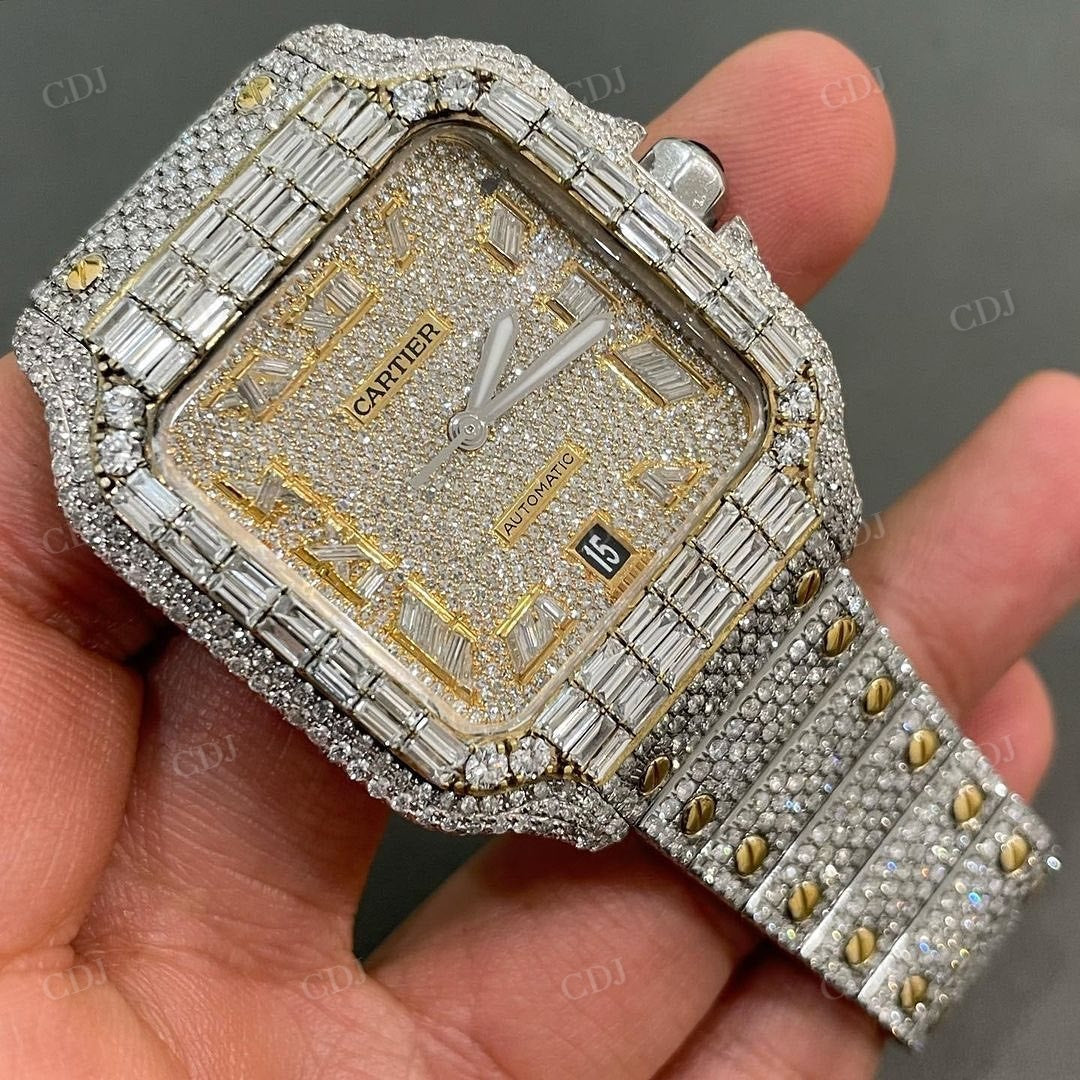 Baguette Diamond Two Tone Cartier Santos Modified Custom Hip Hop Watch