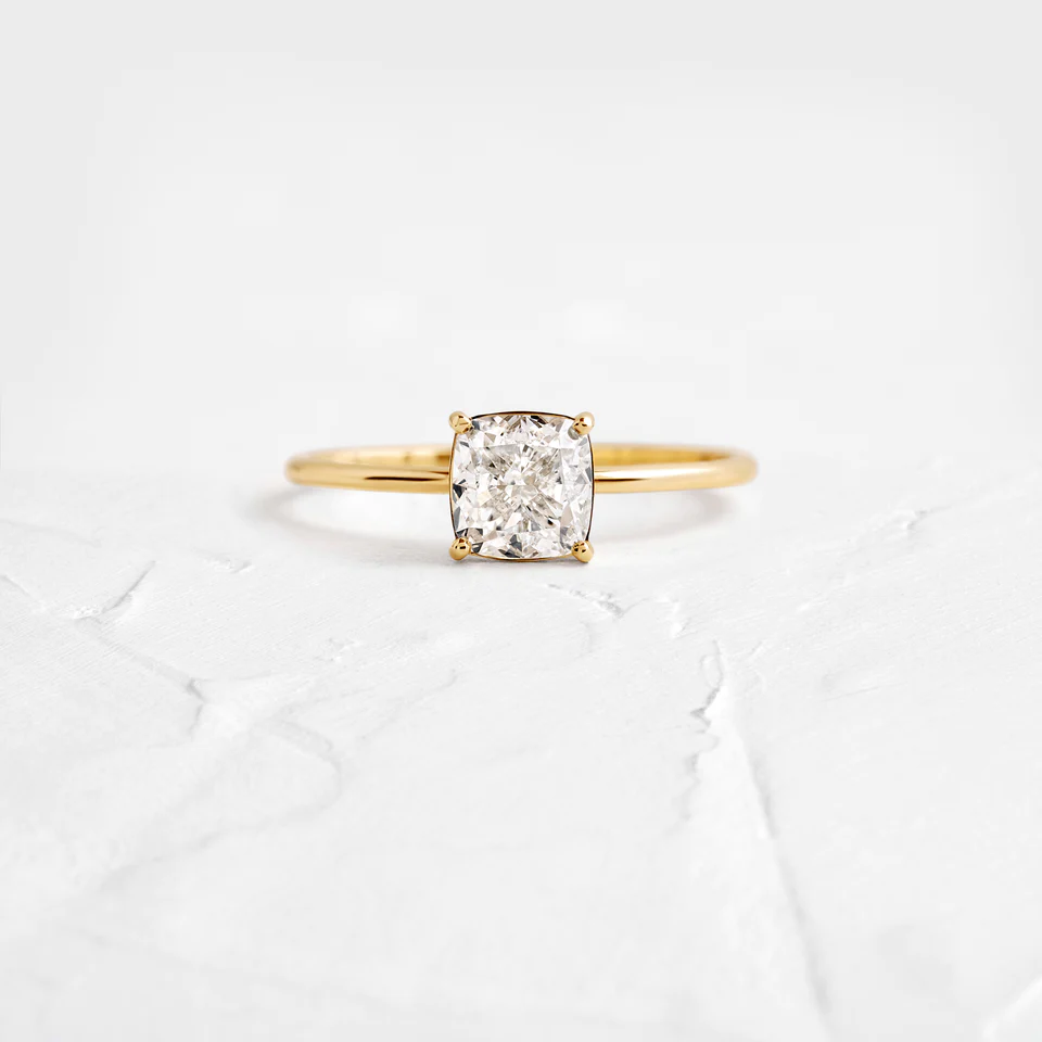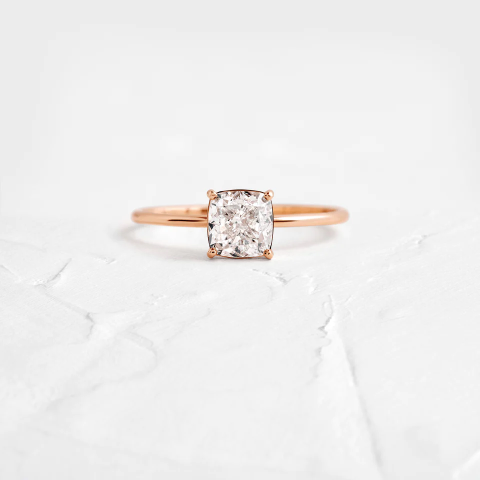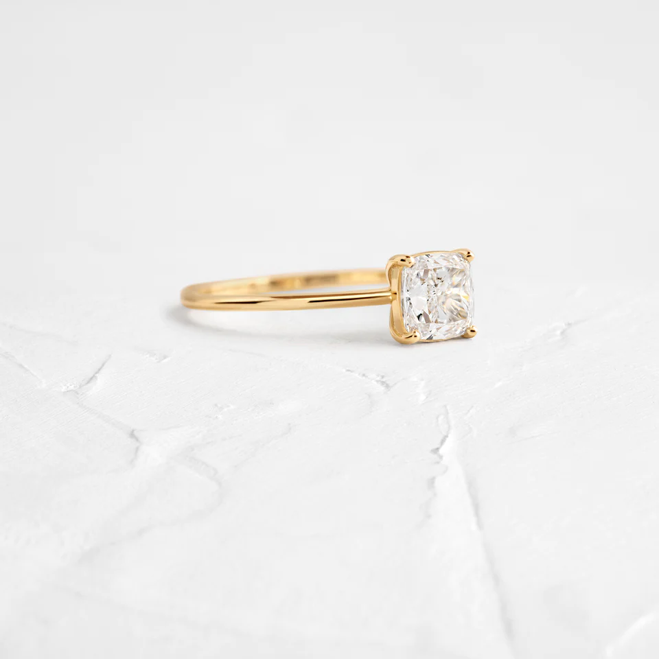 This solitaire wedding ring brings together traditional beauty and modern sustainability. The cushion cut’s softly rounded corners and brilliant faceting create a romantic glow, ideal for brides seeking both style and substance.