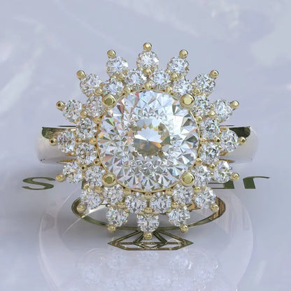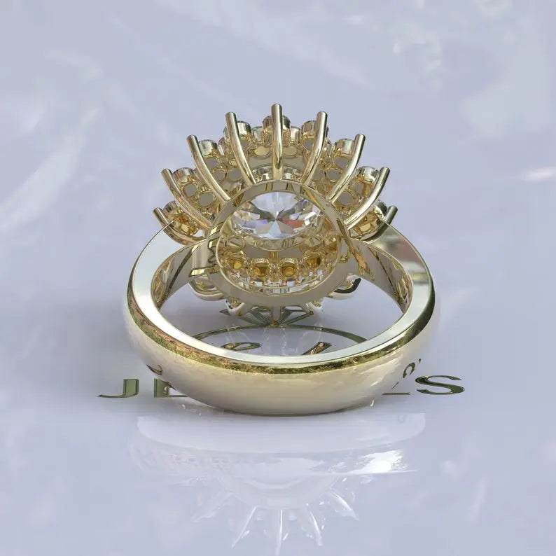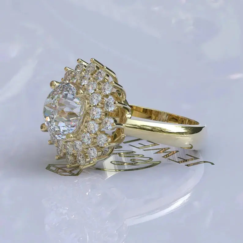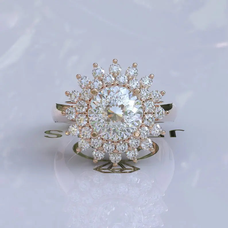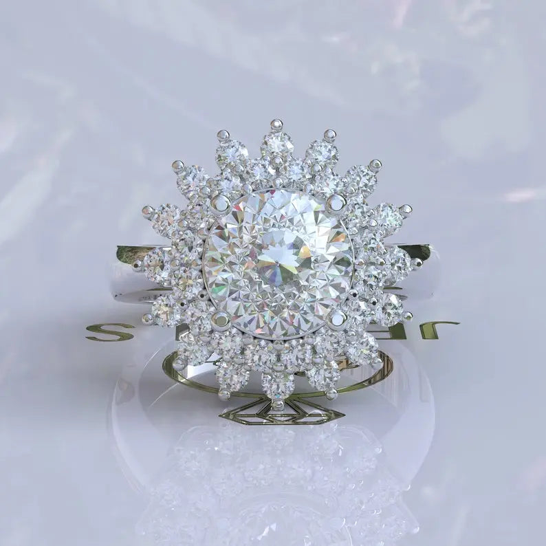 • Double Halo Design: Two concentric halos amplify the center stone’s size and sparkle, creating a luxurious and glamorous look.
