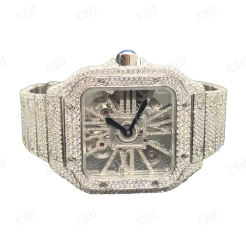 Maintain your Fully Iced Out Swiss Movement Skeleton Watch by wiping it gently with a soft, dry cloth after use. Avoid exposure to harsh chemicals or moisture to preserve its sparkle and Swiss movement precision.