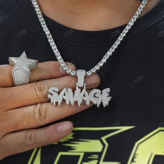 The Hip Hop Iced Out Sterling Silver Savage Pendant features a striking design that embodies confidence and style. This pendant is crafted from high-quality sterling silver and is adorned with numerous sparkling stones, giving it an eye-catching look. Whether you're stepping into a party or making a statement on the street, this pendant ensures all eyes are on you.