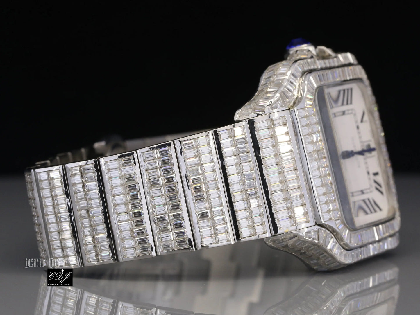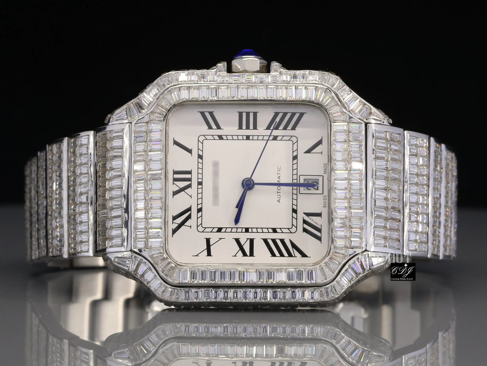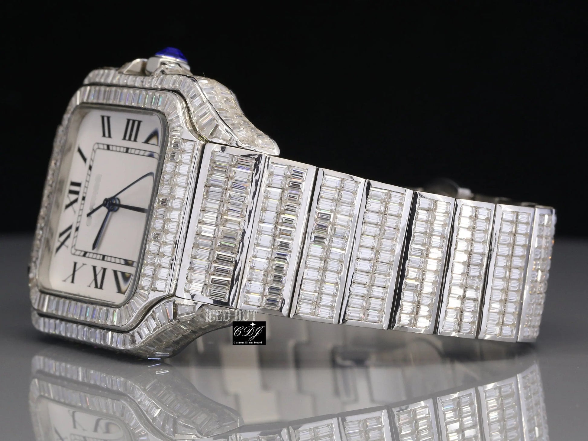 Step into the spotlight with this New Customized Full Baguette Diamond Cartier Men's Iced Out Watch, a masterpiece of craftsmanship and style designed for those who demand the very best. This watch features a full baguette diamond setting that blankets the entire case, bezel, and bracelet with dazzling brilliance, transforming a classic Cartier design into a stunning statement piece.