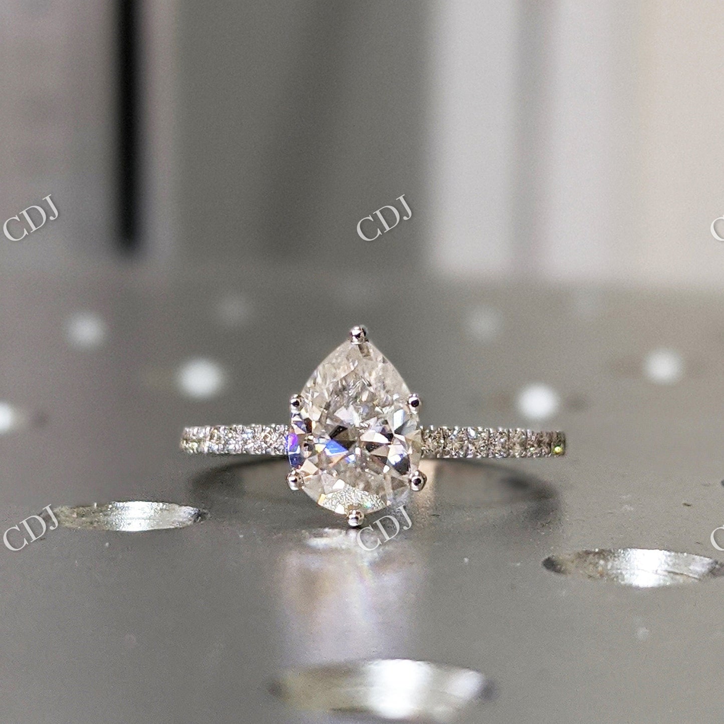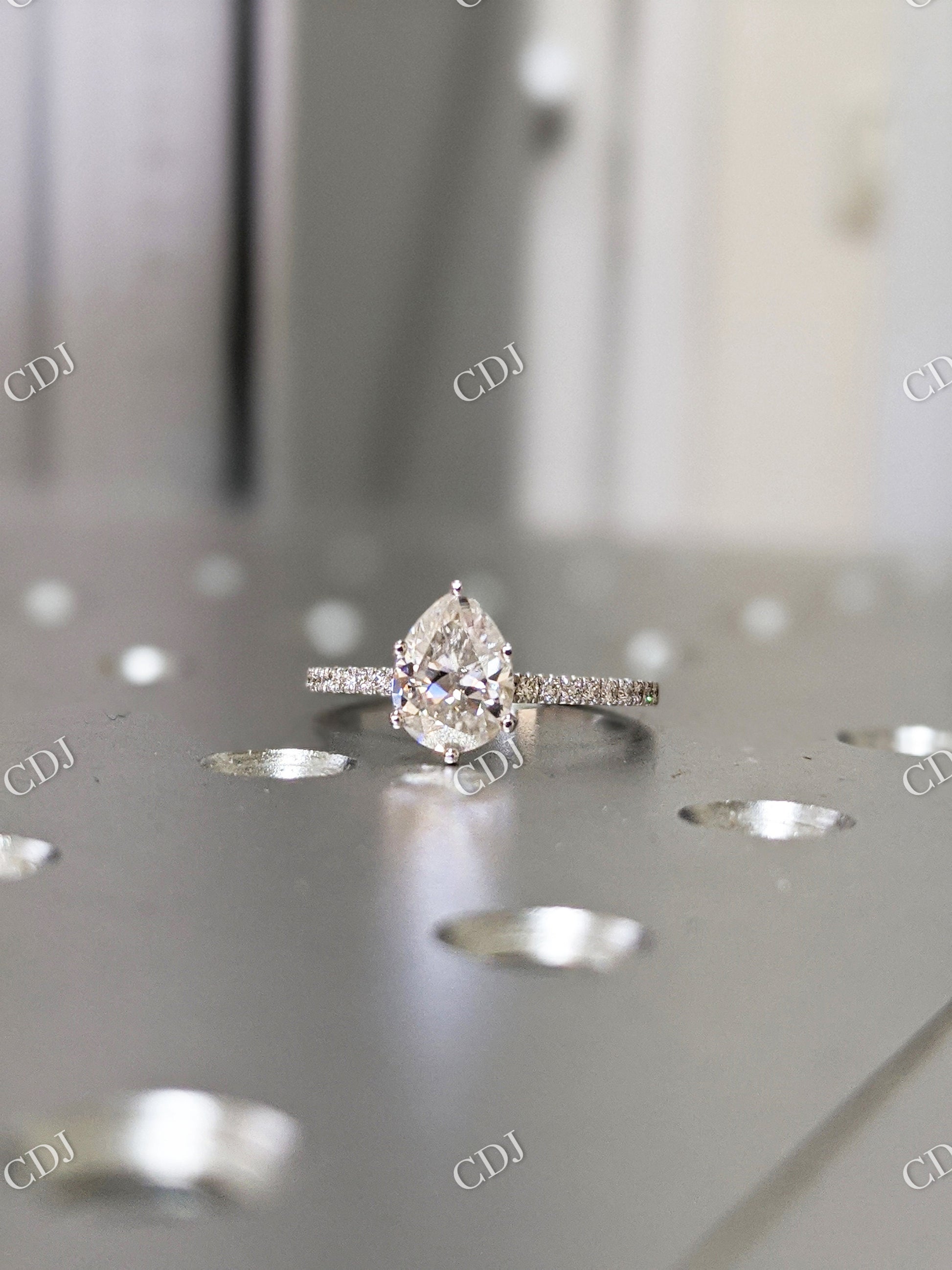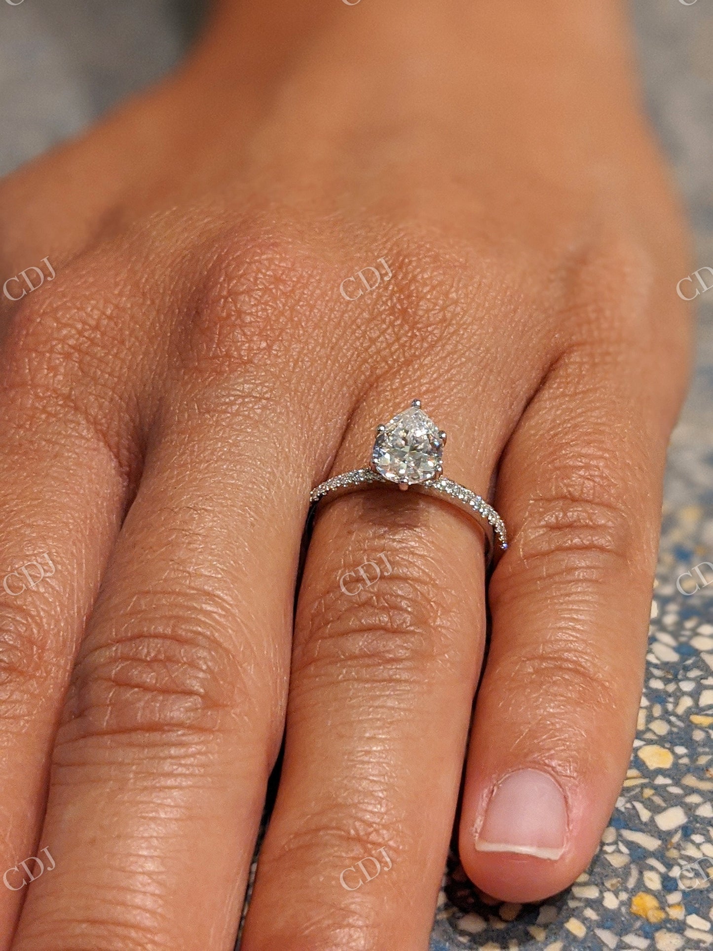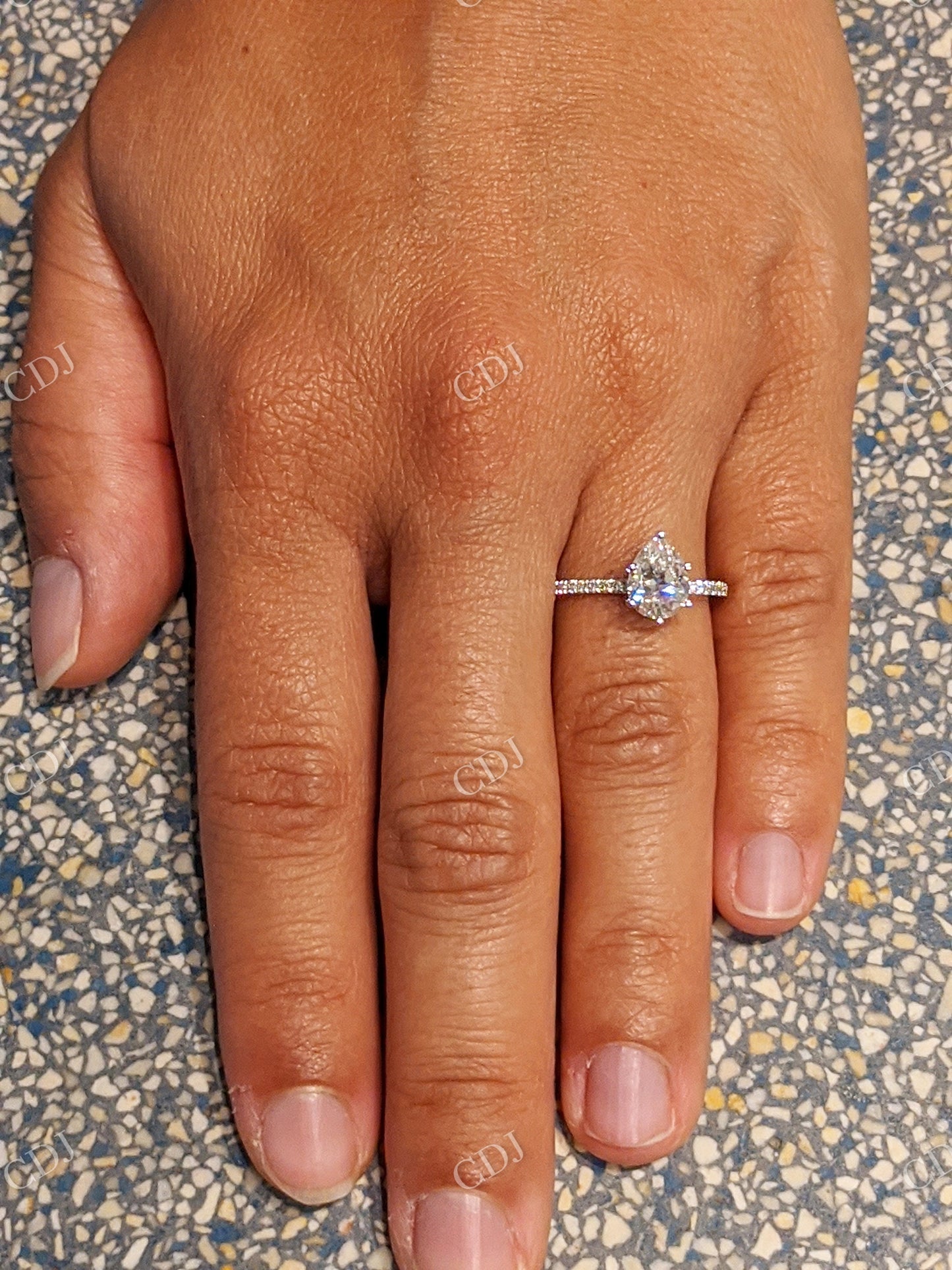 • Pear Shape Moissanite Center Stone: The pear-shaped moissanite at the center of this ring offers a stunning combination of elegance and brilliance. Its teardrop shape is not only visually striking but also designed to maximize sparkle, making it an eye-catching centerpiece.