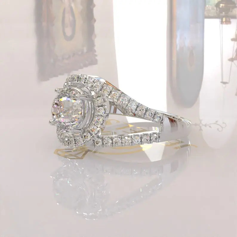 Surrounding the main stone, the halo of smaller moissanite gems magnifies sparkle, creating a dazzling frame of light.