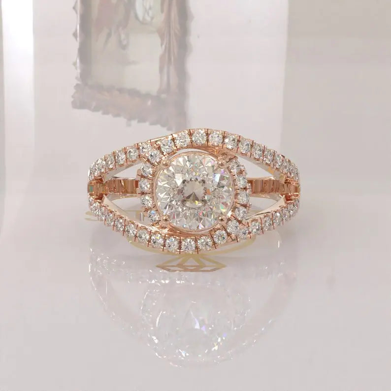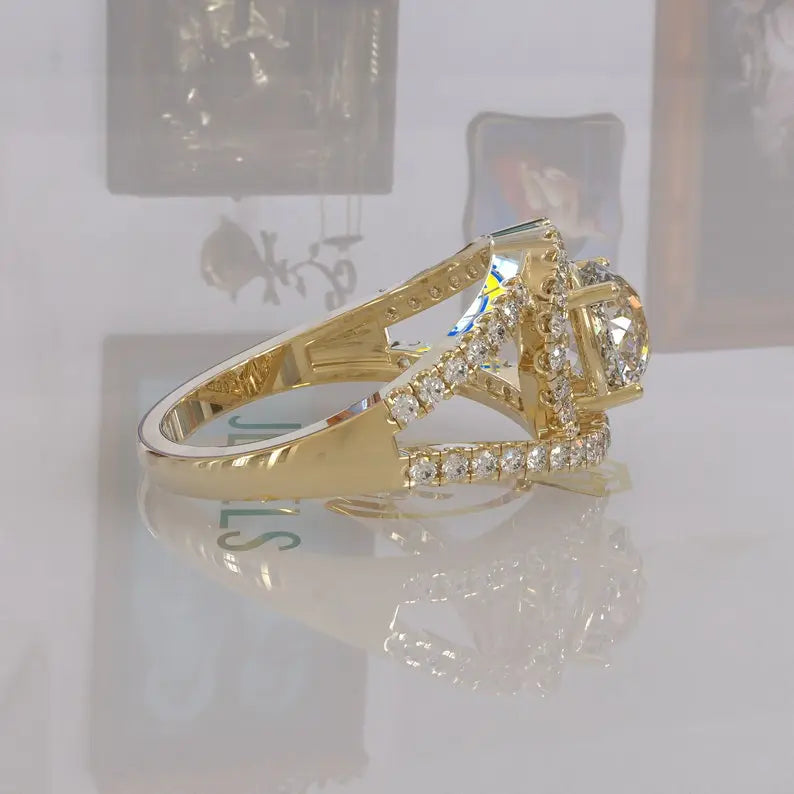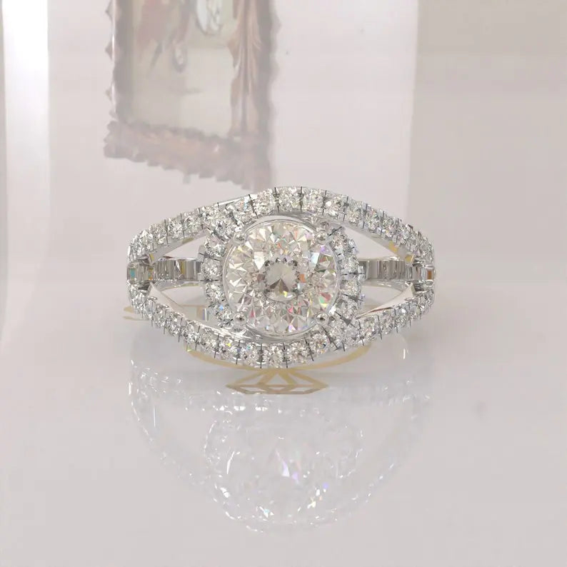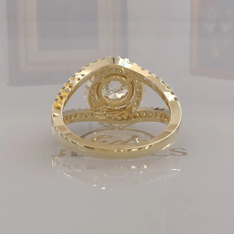 • Halo setting with brilliant moissanite stones enhancing overall radiance
