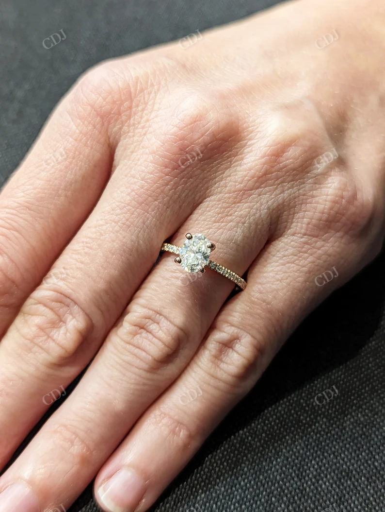 The oval cut moissanite offers an elongated silhouette that beautifully complements the finger, while the rose gold setting adds a romantic and vintage-inspired touch that enhances the stone’s fire and sparkle.