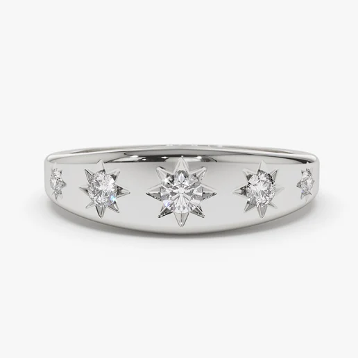 Elevate your wedding jewelry with the Star Setting Graduating Diamond Gold Wedding Band, a stunning piece that combines classic luxury with celestial-inspired design. This wedding band features a unique star setting that securely holds a graduated row of sparkling diamonds, creating a dazzling effect that gently tapers in size for graceful sophistication.