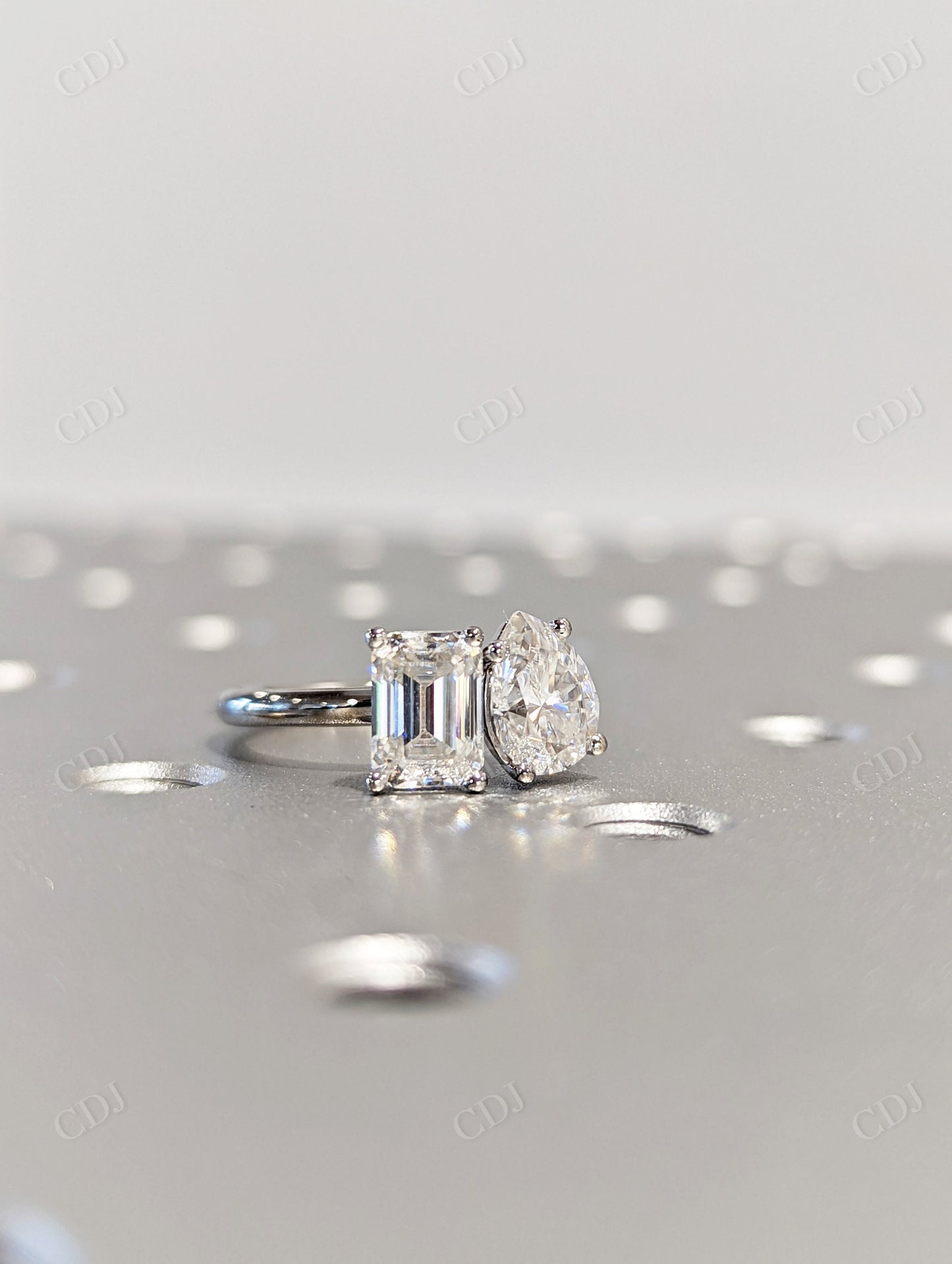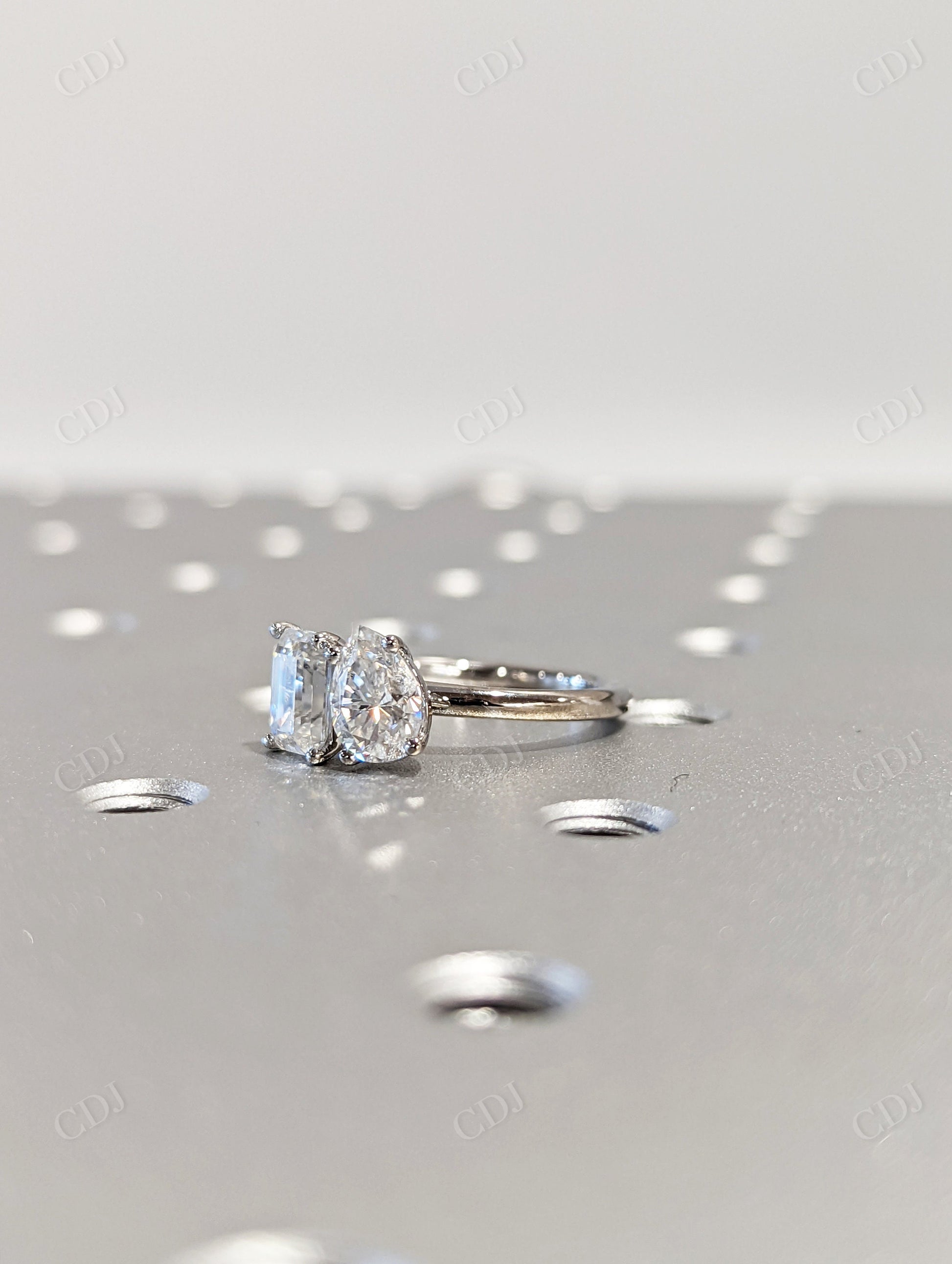 Two Stone Engagement Ring Pear Cut and Emerald Cut Moissanite Ring