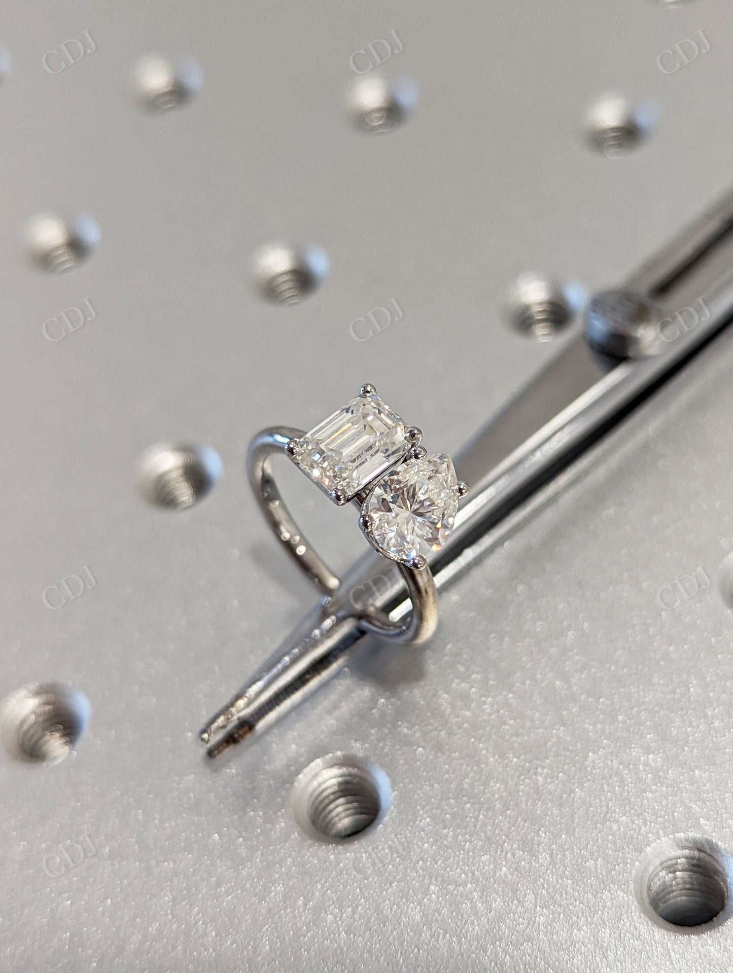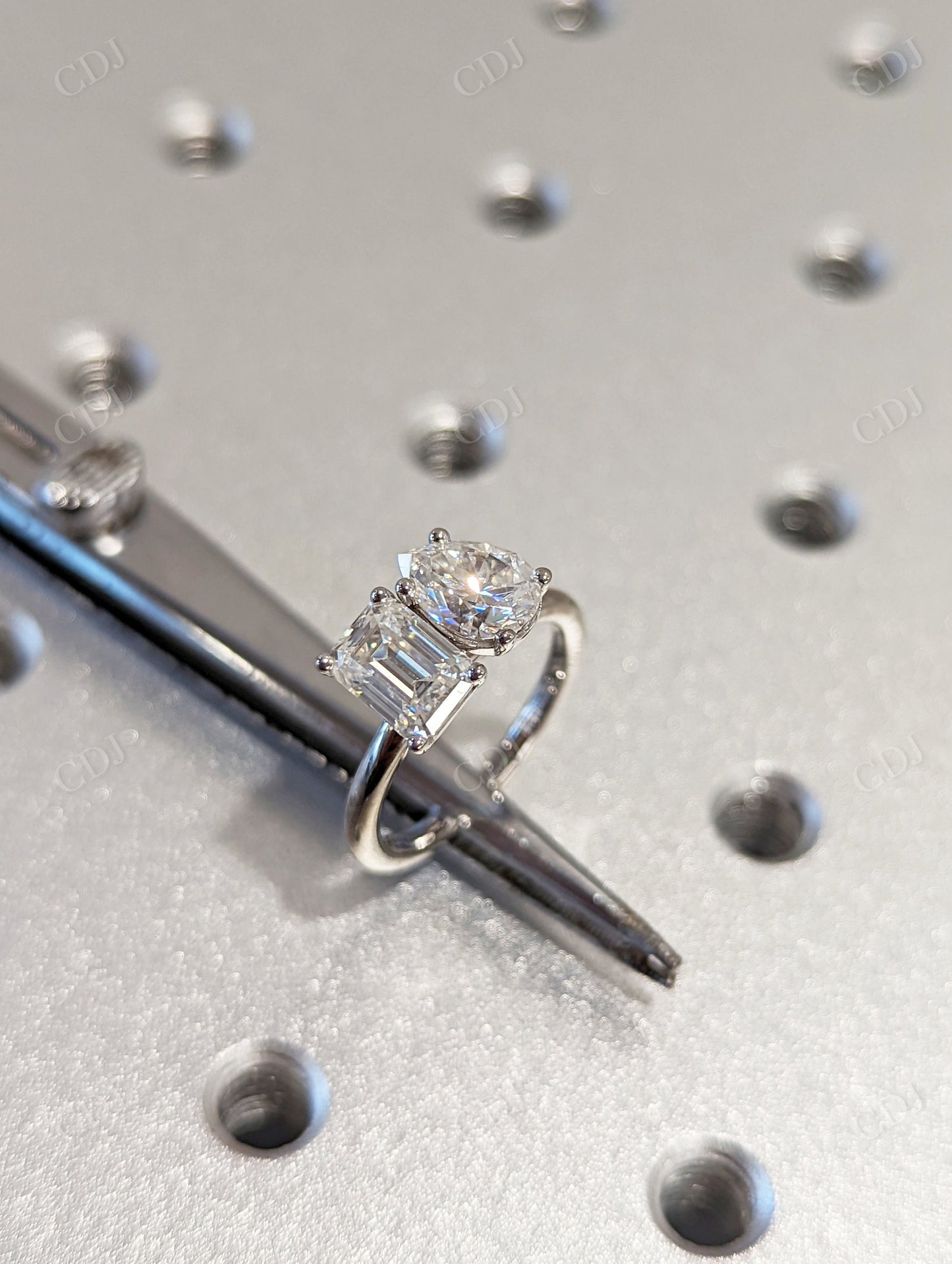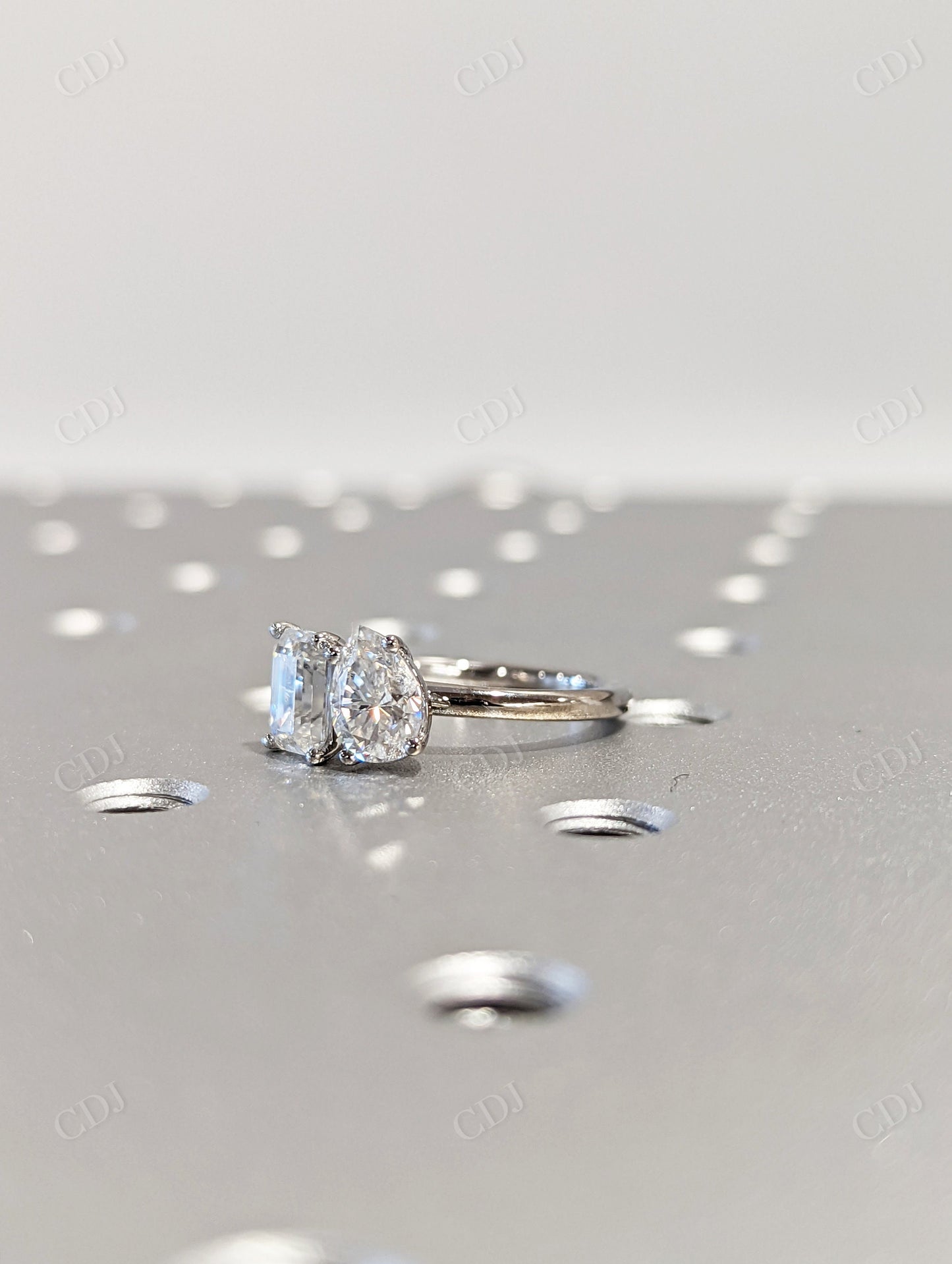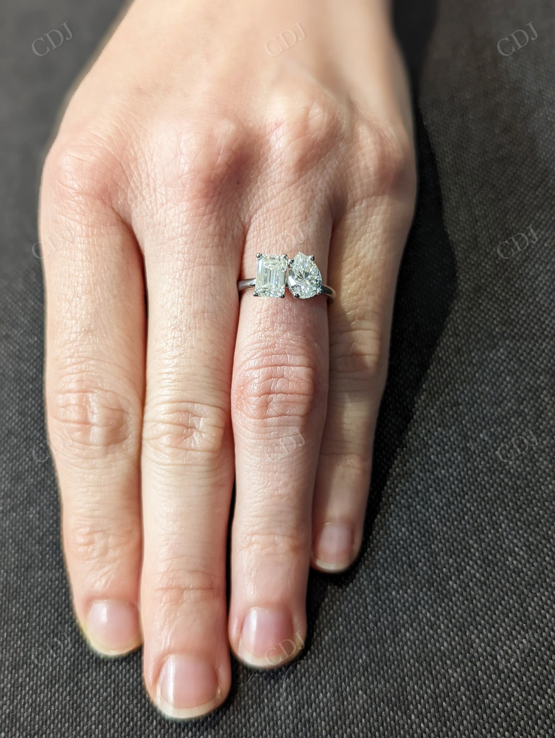 • Stone Combination: One pear cut and one emerald cut moissanite