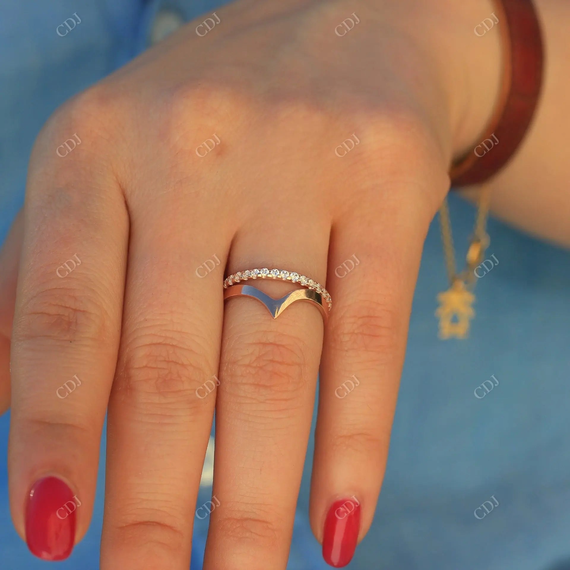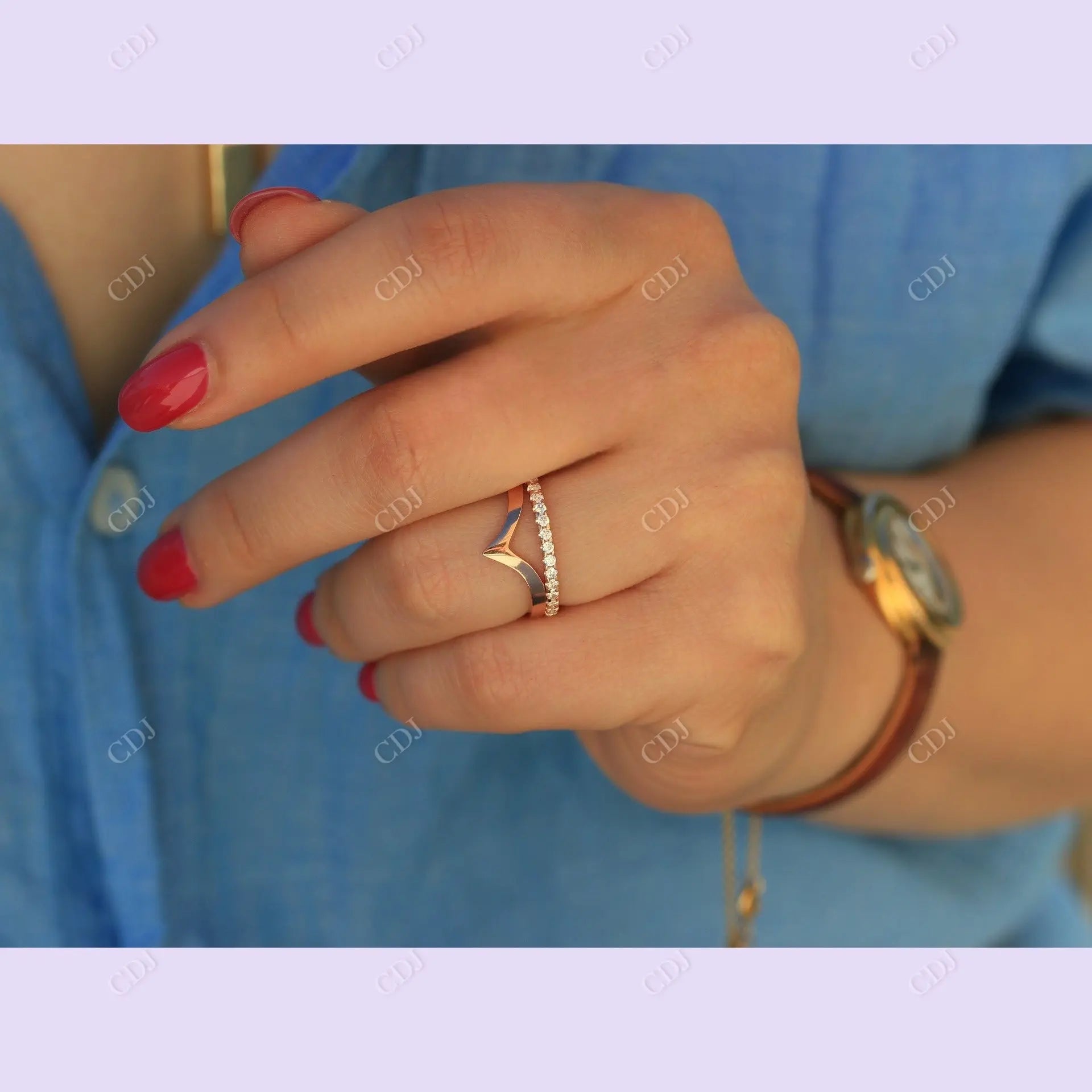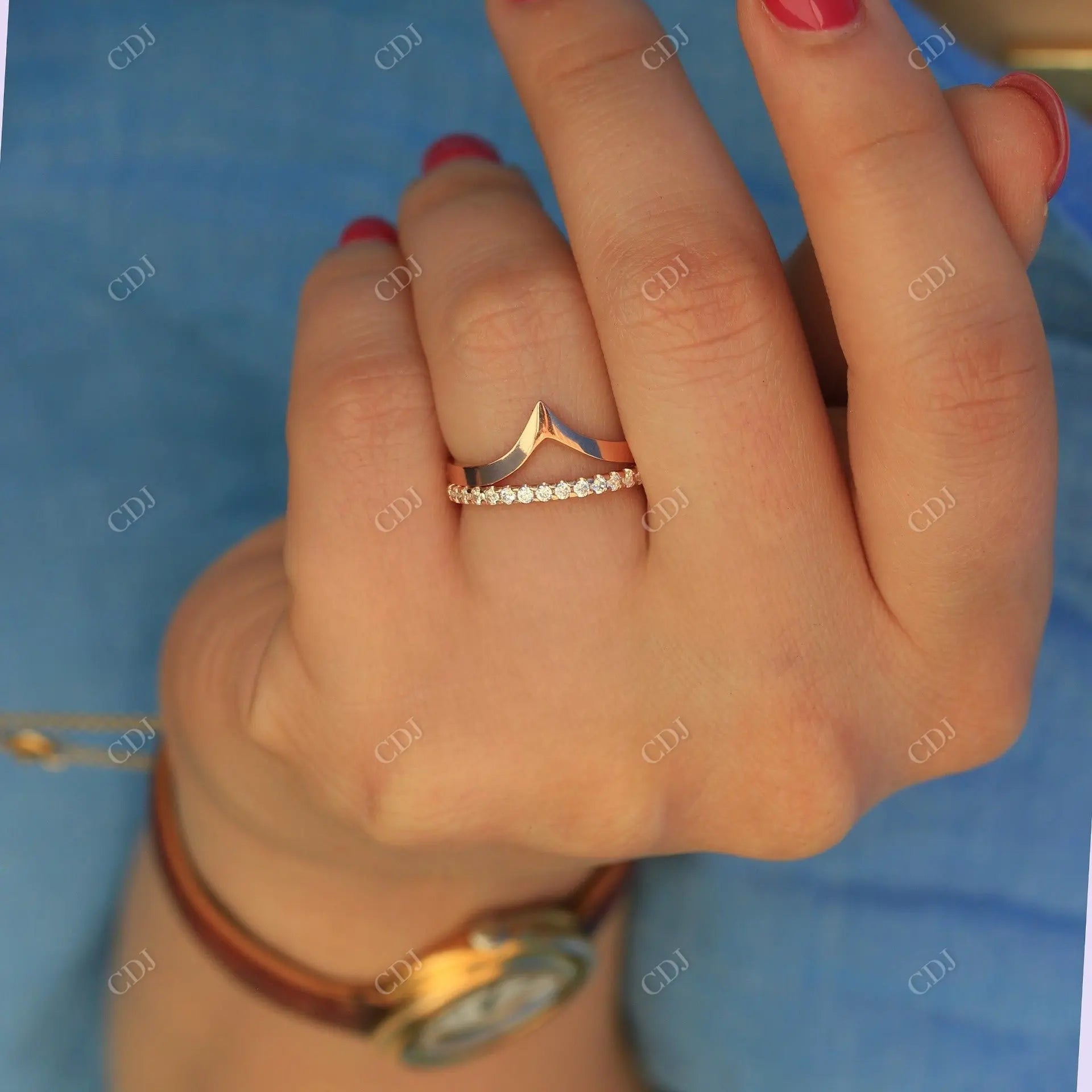 • The V-shaped contour hugs your engagement ring or adds an eye-catching twist when worn solo.