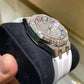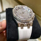 The smooth white strap offers a clean, contemporary contrast to the sparkling face, creating a balanced and luxurious aesthetic.